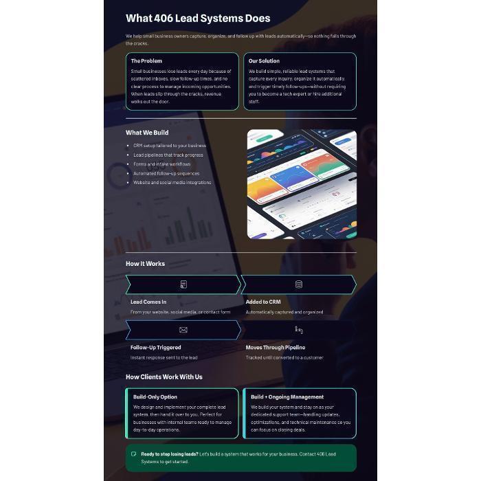 406 Lead Systems provides lead capture, automation, CRM setup, and local visibility optimization for service-based businesses. We help companies rank locally, track every call and form submission, and automate follow-up so no leads are missed. Services include GoHighLevel setup, Google Business Profile optimization, conversion tracking, and local advertising systems.