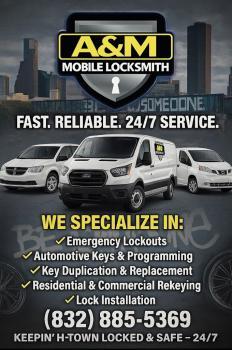 A&M Locksmith is your trusted locksmith near you in Houston, TX, providing honest, reliable, and affordable service for over 20 years. With 70,000+ satisfied customers, we offer 24/7 emergency locksmith services near you, residential lock rekeying, keyless entry installation near you, commercial access control, master key systems, and automotive key replacement near you. Whether you need home, business, or car locksmith help, our licensed experts deliver fast, dependable results. Call A&M Locksmith Houston today for trusted service you can count on!