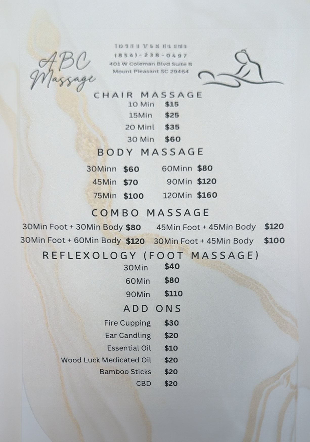Welcome to ABC Massage in Mount Pleasant, SC — a professional Body massage spa focused on comfort and care. Step into clean, well-organized private and couple rooms where Licensed therapists tailor each session to how you like to relax. Choose from full body, deep tissue, Swedish, hot stone, or reflexology for a calm, balanced experience. From easy check-in to a quiet, tidy setting, every detail is designed to help you unwind and feel refreshed after your day.