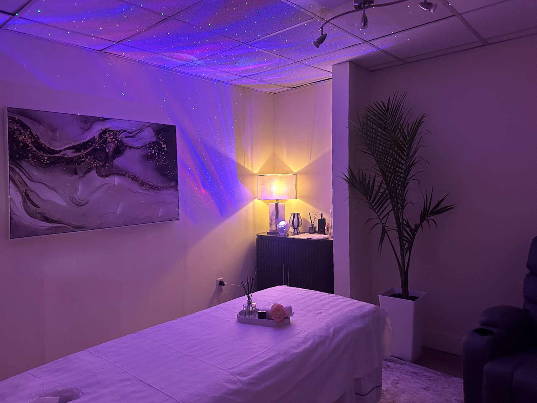 Relaxing single treatment room with soft ambient lighting and clean linens