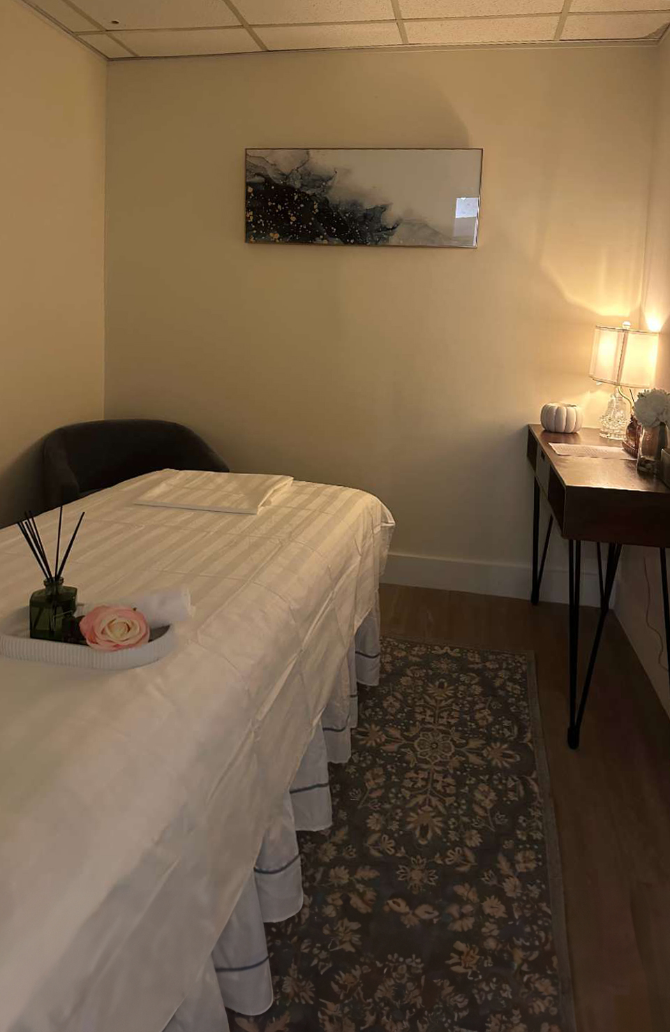 Front-area chair massage station with clean setup and soft lighting