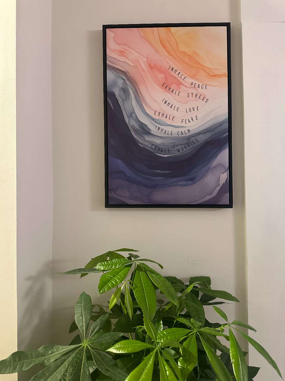 Wall art with motivational quote and indoor plant by the hallway