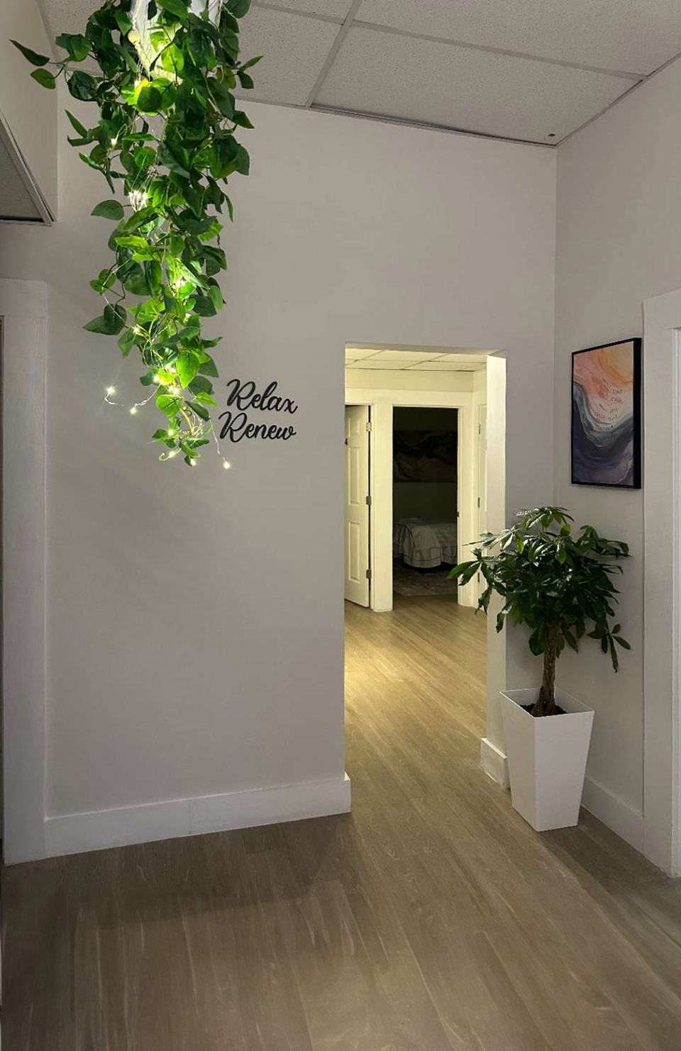 Calm hallway with greenery leading to private treatment rooms