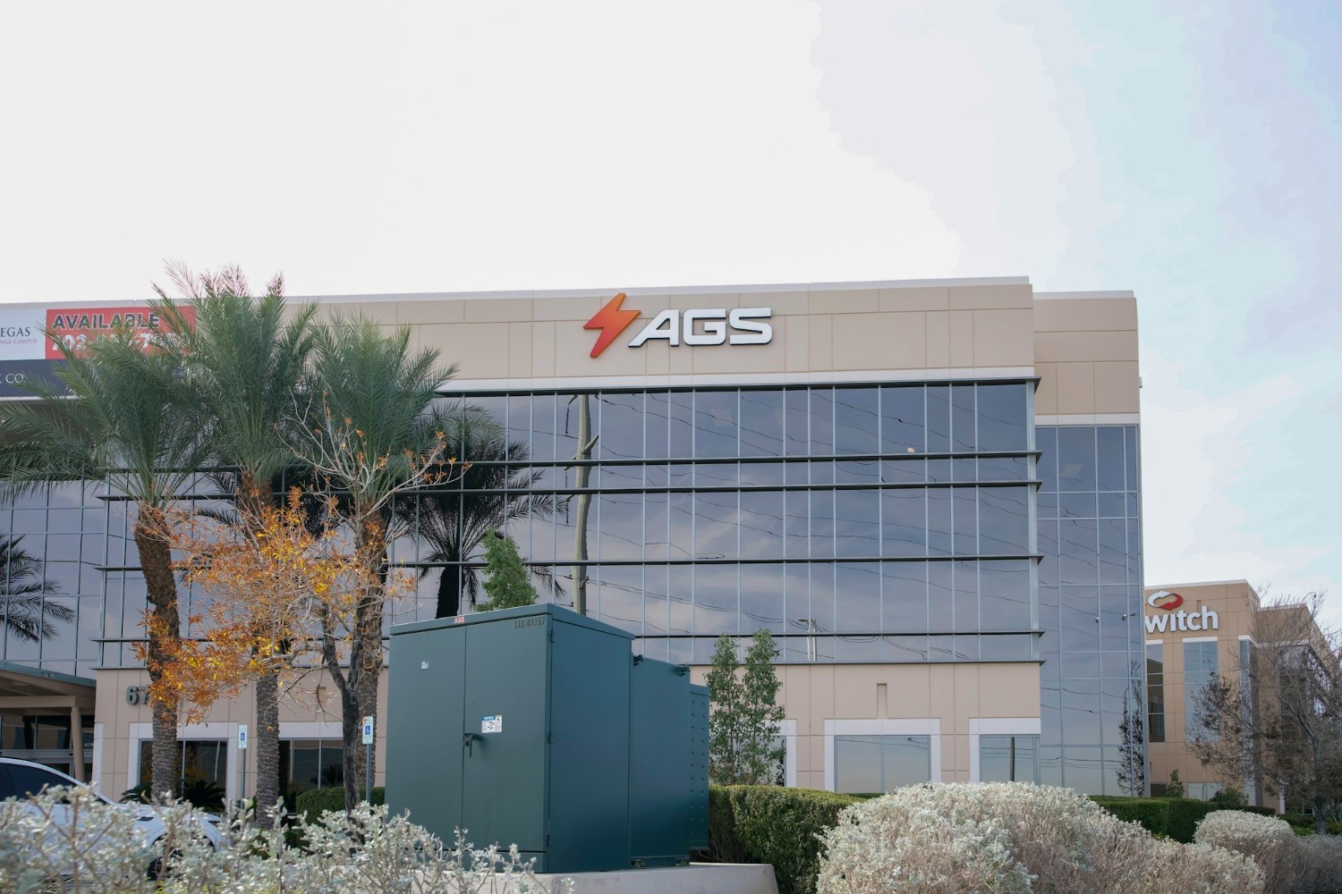 Main entrance and signage of AGS, a global casino cabinet supplier and casino product developer known for premium slot machines, proprietary table games, and digital gaming solutions.