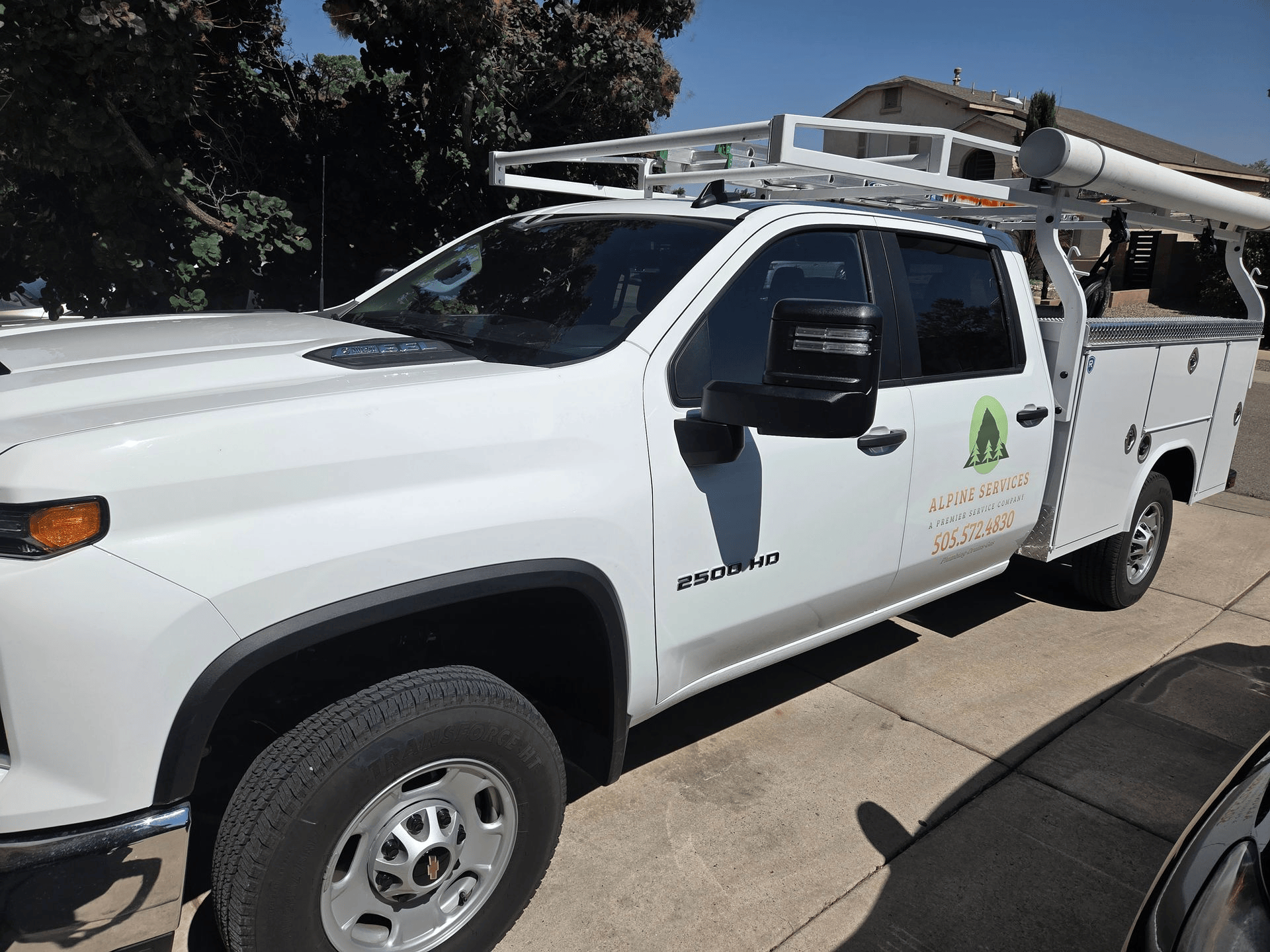 A white Alpine Services work truck is parked on a driveway. It's a heavy-duty pickup with a custom ladder rack, side storage compartments, and the company logo on the door.