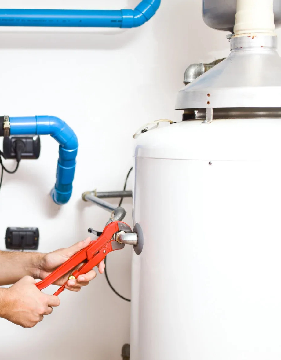 A close-up view of a person's hands using a large red wrench to work on a white water heater. Blue and silver pipes are visible in the background against a white wall.
