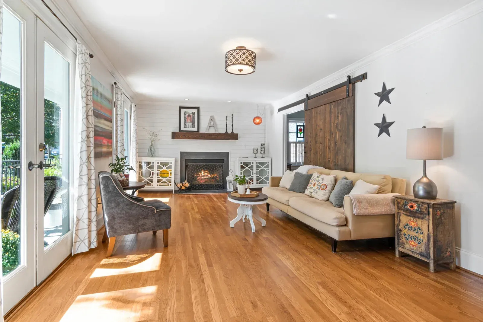 A cozy living room features warm honey oak floors, a fireplace, and a beige sofa. The room is bright with natural light, showcasing a rustic barn door and white walls.