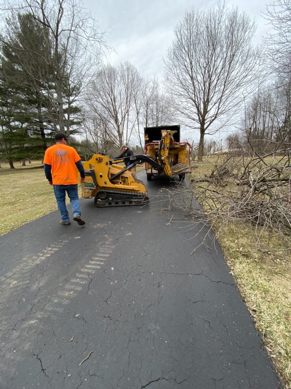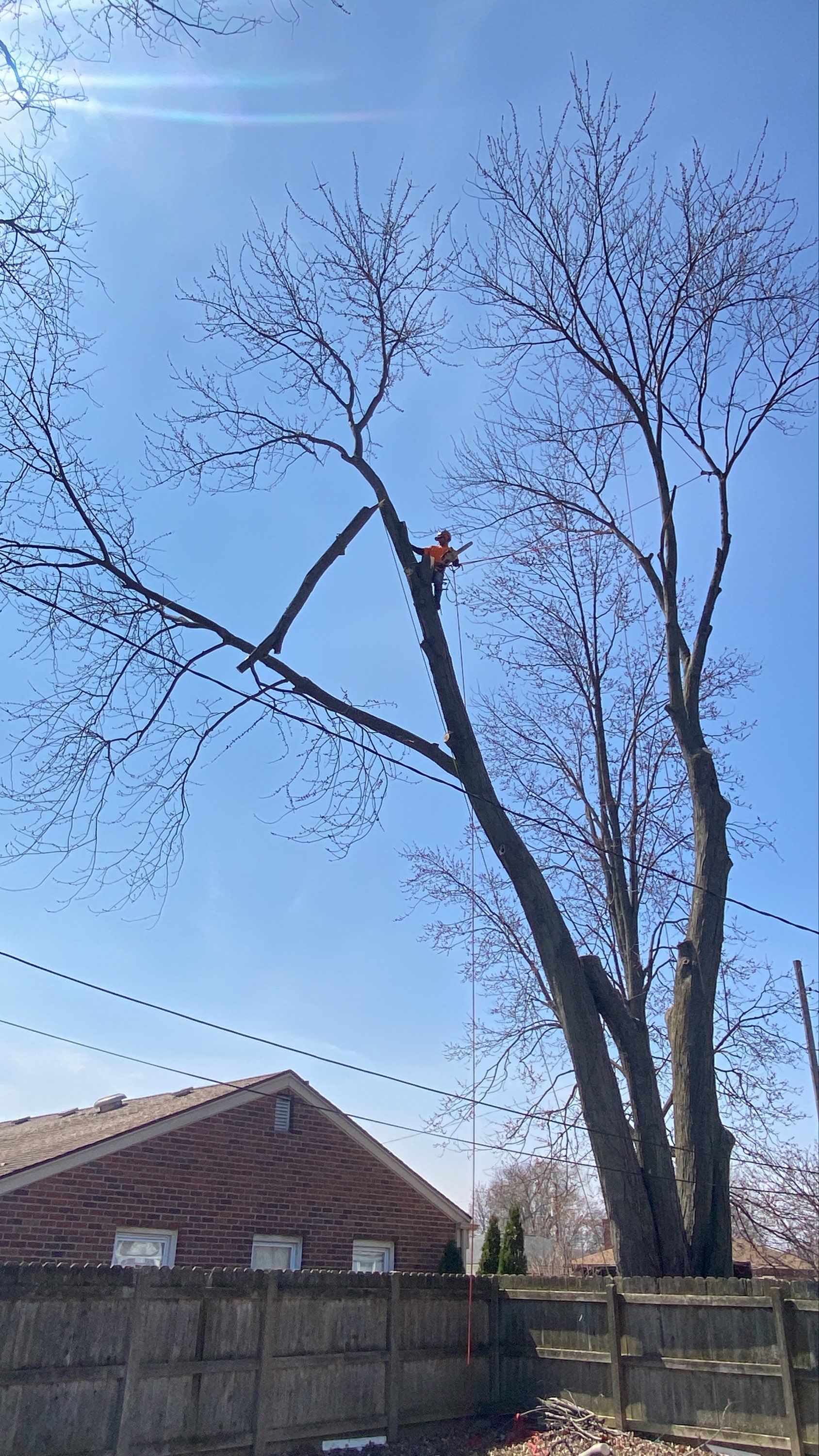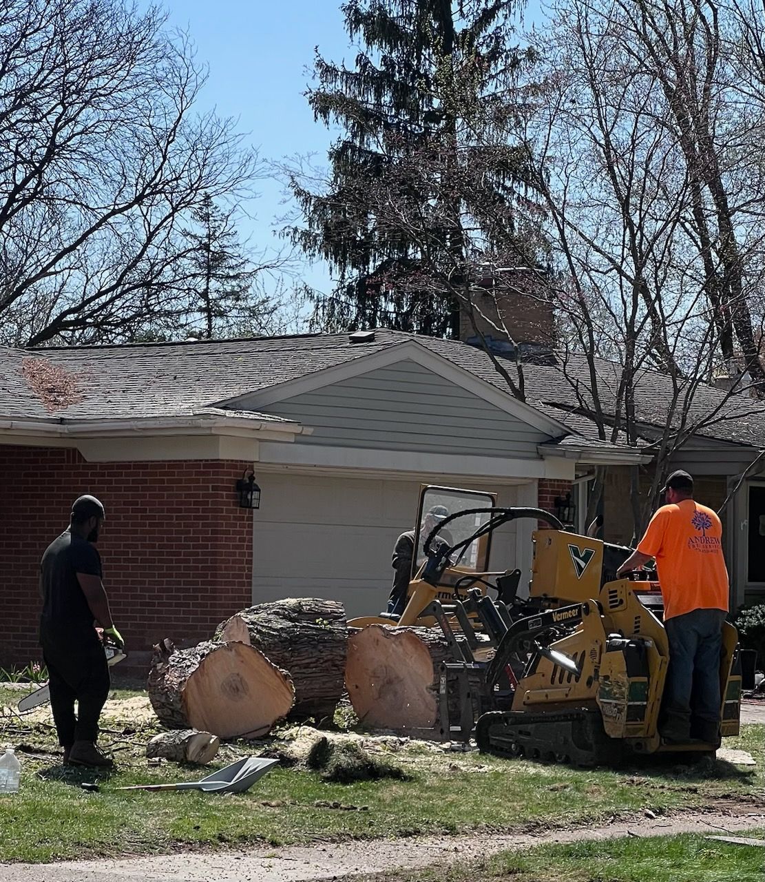 A crew works to remove a large, bare tree from a yard. One worker in an orange shirt is using a tool to cut off branches.