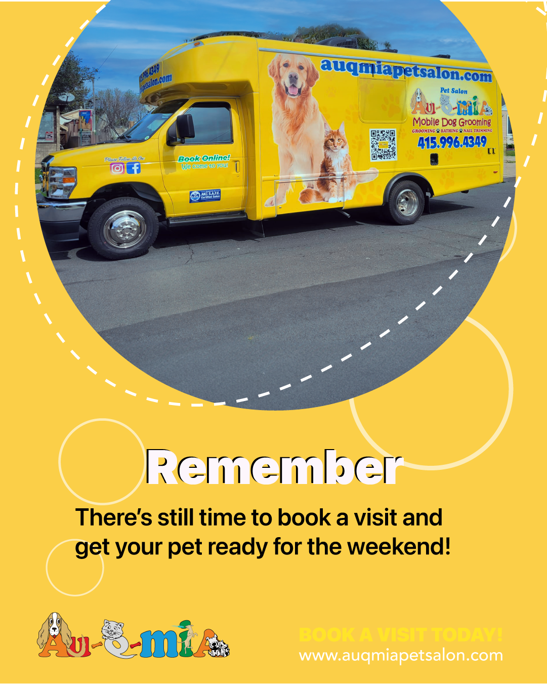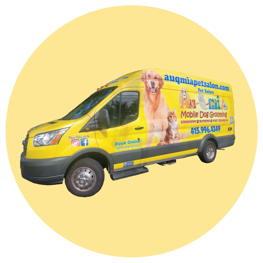 AU-Q-MIA PET SALON is a premium mobile grooming service covering the Bay Area, from San Francisco to San Jose. With 15+ years of experience, certified AKC groomers bring top-quality baths, VIP haircuts, deshedding, coat hydration, and paw care right to your home. Our custom Wag’n Tails vans provide fresh warm water, air conditioning, heater for cold days, and professional bath tubs — ensuring safety and comfort for pets and groomers. We specialize in Doodles, Goldens, Poodles, Shih Tzus, Maine Coons, and sensitive coats. Trusted by families who value health, beauty, and convenience.