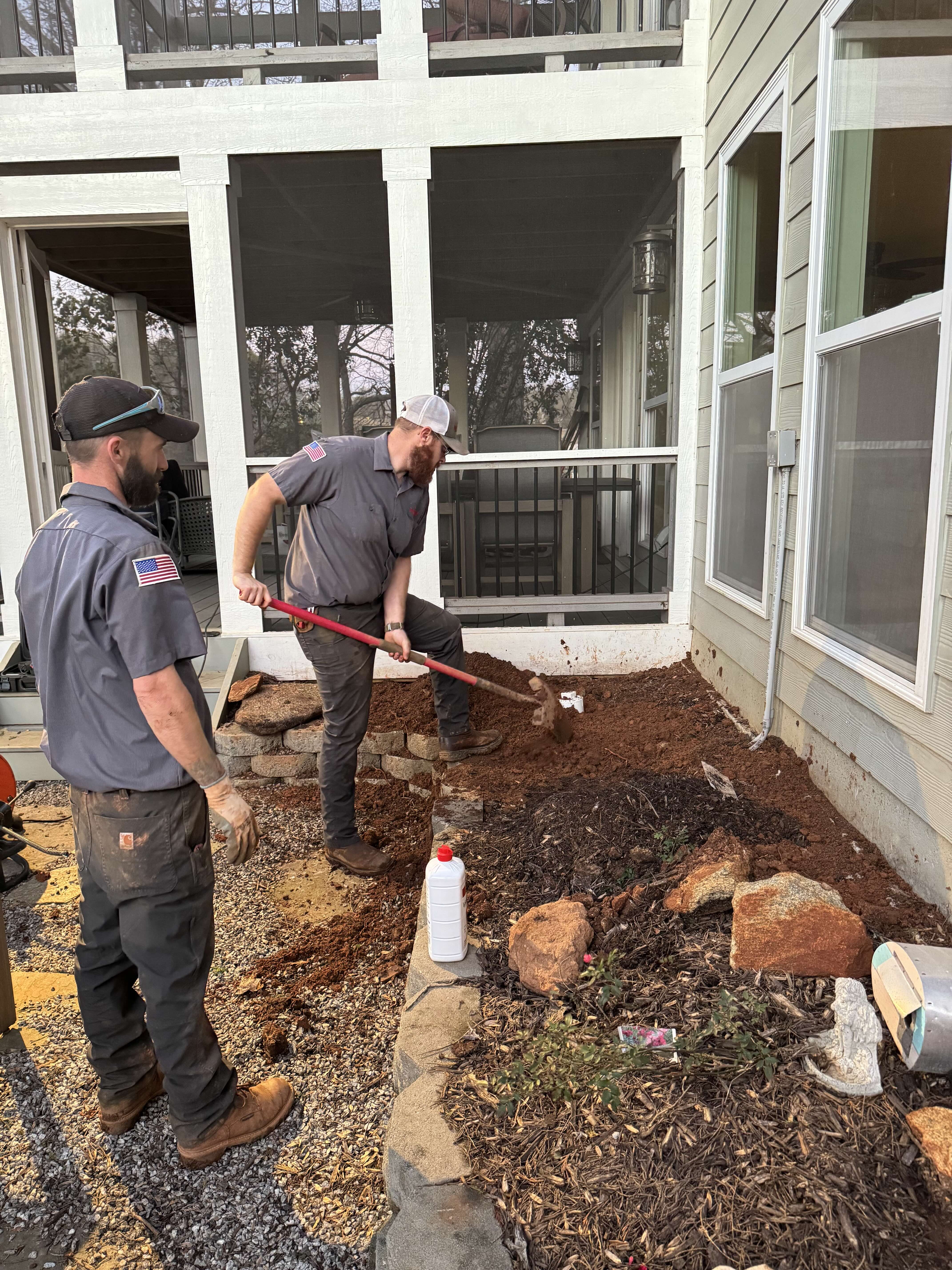 Kevin, owner of Babb’s Plumbing, is pictured using a shovel while working alongside a team member on a trench or landscaping restoration. Dressed in Babb’s branded gear, the team is restoring a worksite outside a home, reflecting their commitment to leaving every job site clean and customer-ready. The photo captures Babb’s hands-on approach, teamwork, and pride in doing quality work from start to finish.