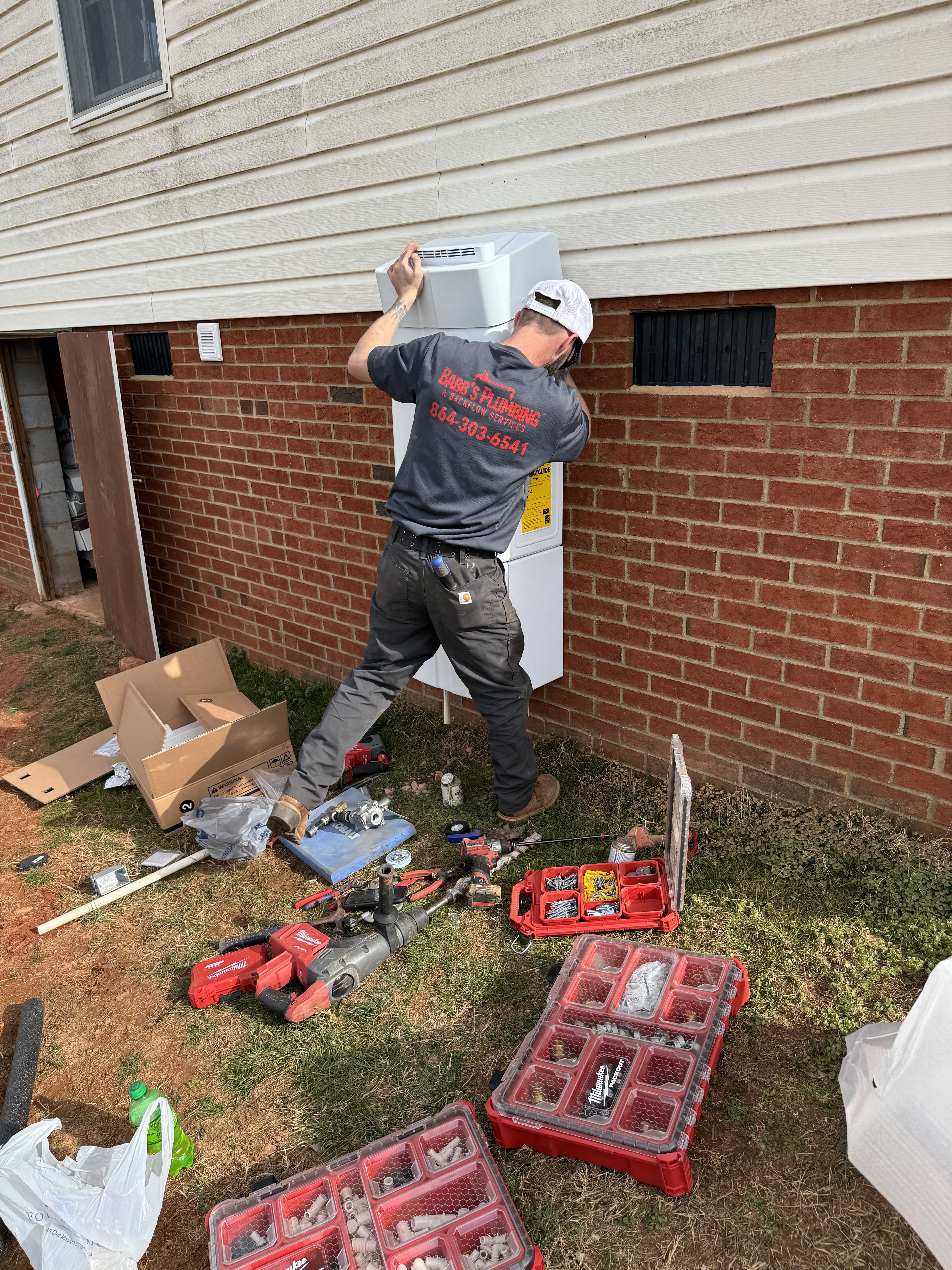 Kevin, owner of Babb’s Plumbing, is hard at work installing a tankless water heater on the exterior of a brick home. Wearing his branded Babb’s Plumbing shirt and surrounded by tools and organized parts, Kevin exemplifies hands-on leadership and expert service. The scene captures the company’s commitment to quality, professionalism, and doing the job right the first time.
