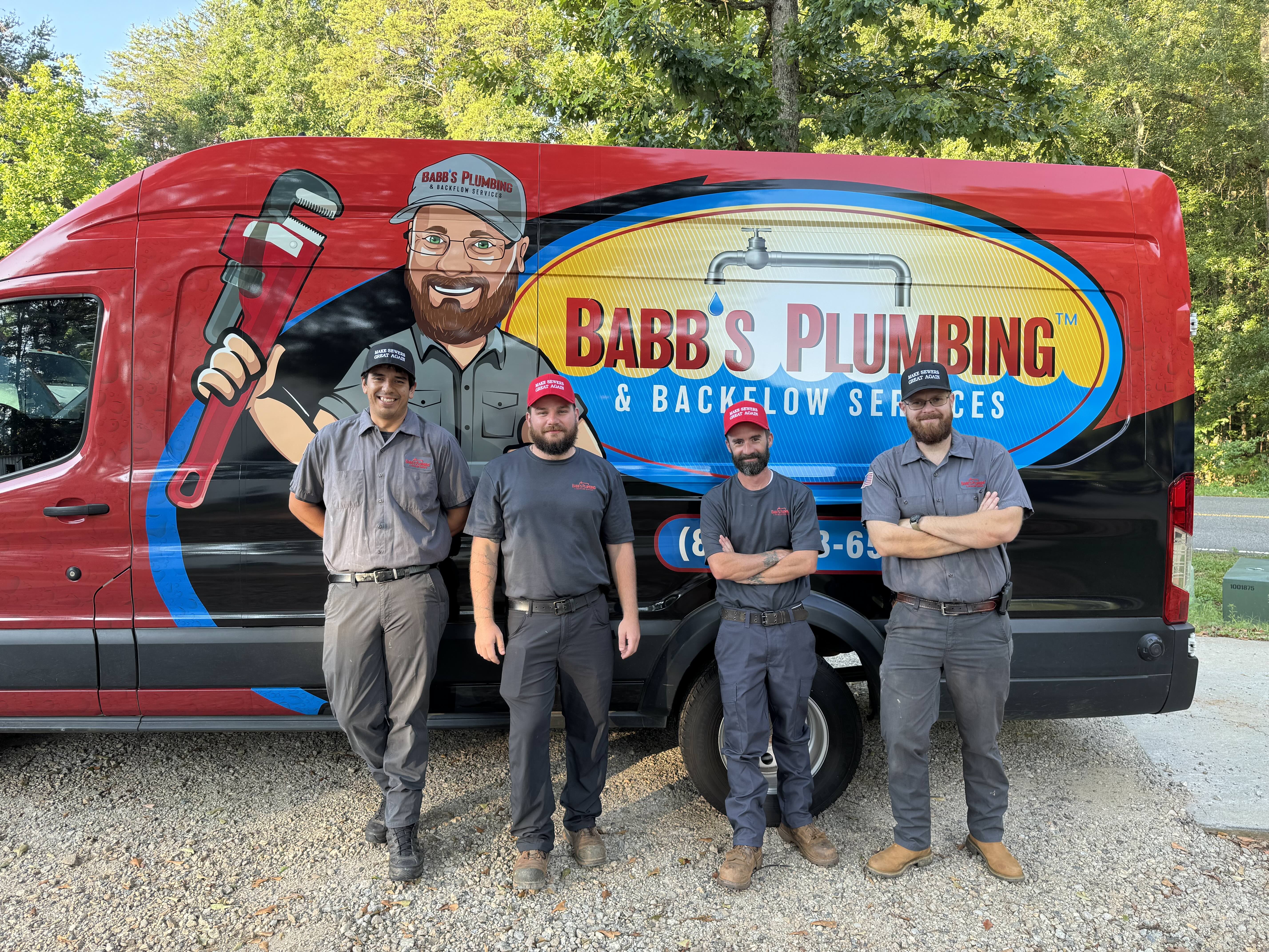 Kevin, owner of Babb’s Plumbing, stands proudly on the far right alongside his team in front of a bold, branded service van. The van features the Babb’s logo and a fun cartoon of Kevin holding a pipe wrench. Dressed in matching uniforms and hats, the group reflects the company’s values of teamwork, professionalism, and phenomenal service.