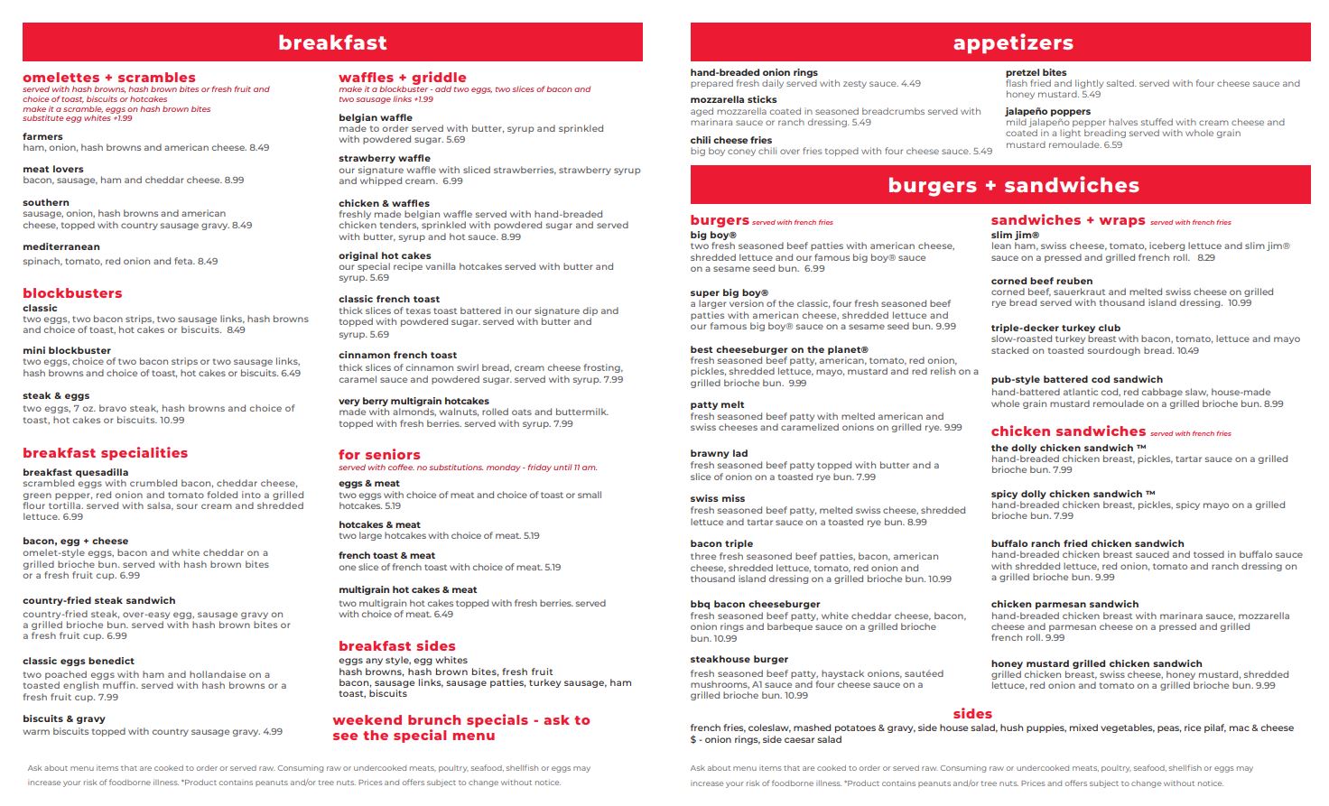 Since 1936, Big Boy Restaurants has been serving generations of guests with timeless American comfort food and a warm, welcoming atmosphere. Home of the original Big Boy burger, our menu features something for everyone: hearty homestyle breakfasts, delicious burgers and sandwiches, fresh salads, classic dinner plates, and irresistible desserts like our hot fudge ice cream cake and signature pies.