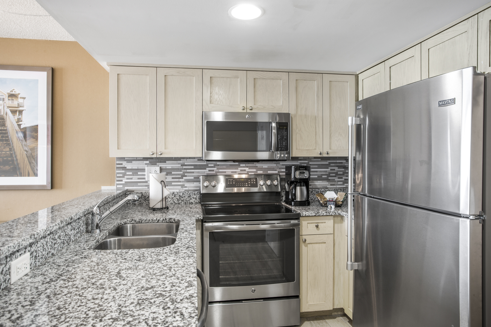 A kitchen in an accommodation at Boardwalk Resort and Villas. It features a sink, full refrigerator with freezer, microwave, oven with stovetop, coffee maker, and stone countertop.