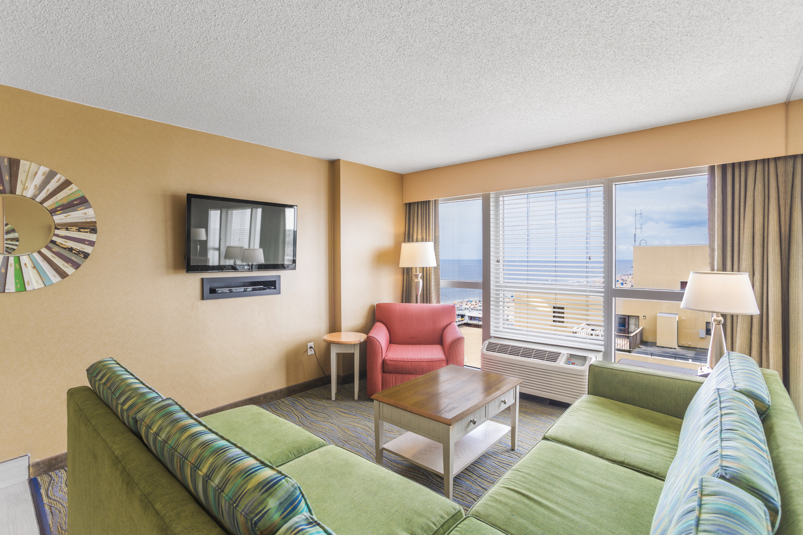 The living area of an accommodation at Boardwalk Resort and Villas. It features an ocean view of Virginia Beach.