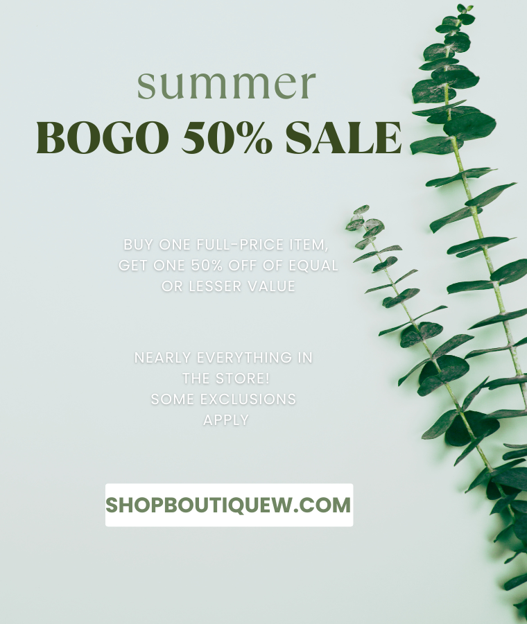 Buy one full price item, get one 50% off equal or lesser value on almost every item in the store from July 9th thru July 20th! Only exclusions are Magnolia Pearl, Michael Stars, LJ Sonder, and Rocky's Hardwear.