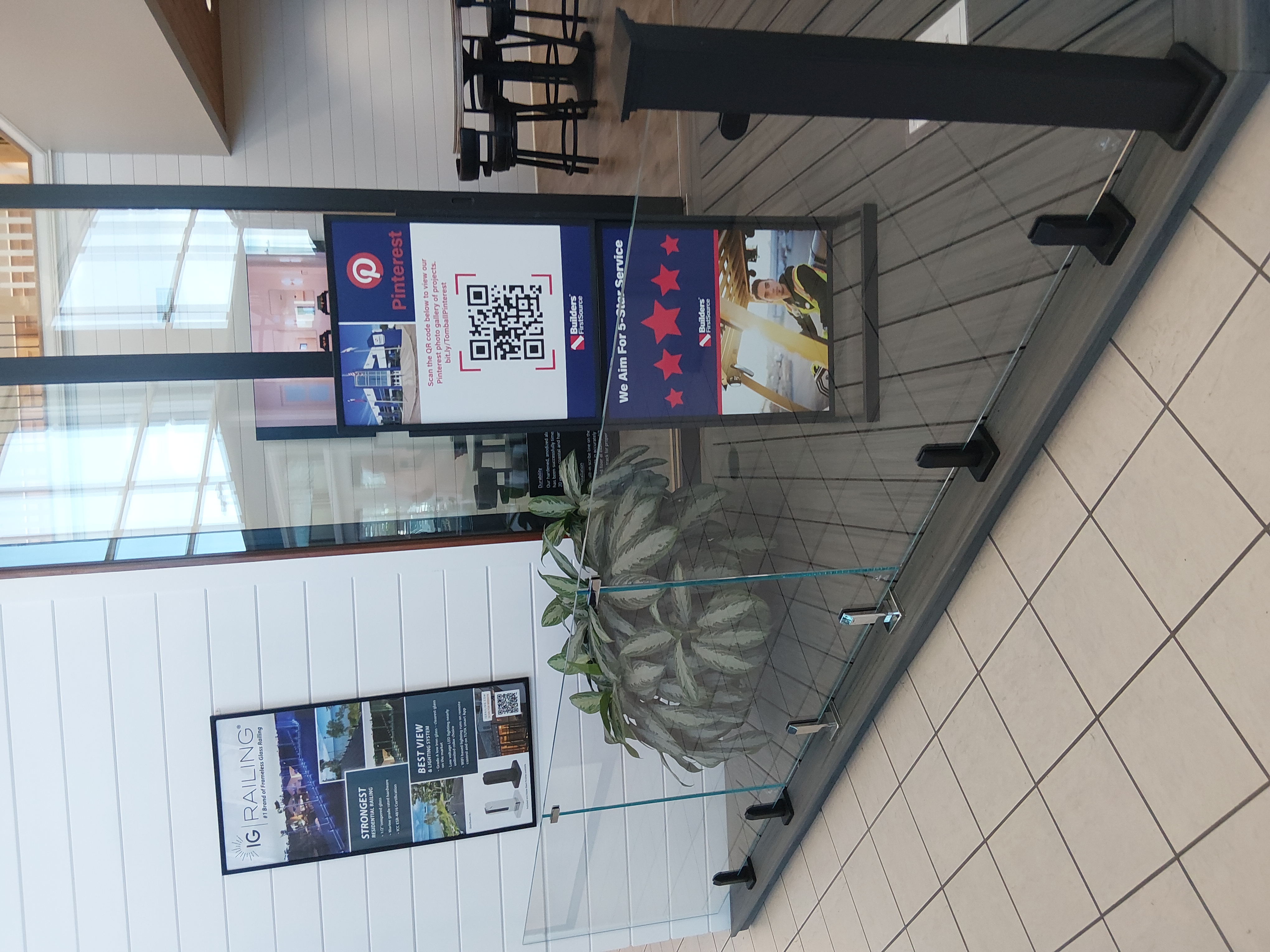 Frameless glass railing installation by IG Railing displayed inside a Builders FirstSource showroom, featuring clear glass panels secured with floor‑mounted hardware alongside showroom signage and customer seating.