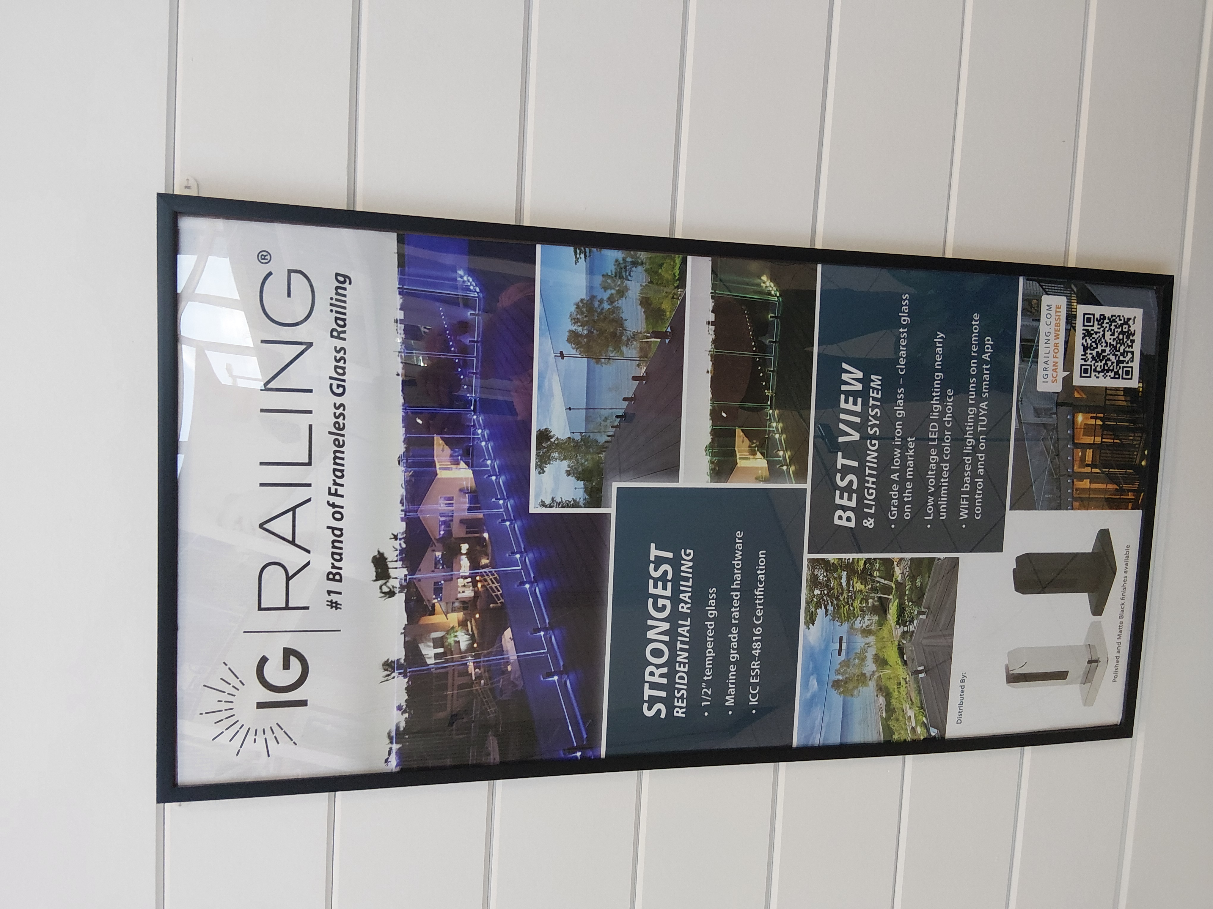 IG Railing product display poster showcasing frameless glass railing systems, highlighting tempered glass panels, residential railing strength, and integrated LED lighting features inside a Builders FirstSource showroom.