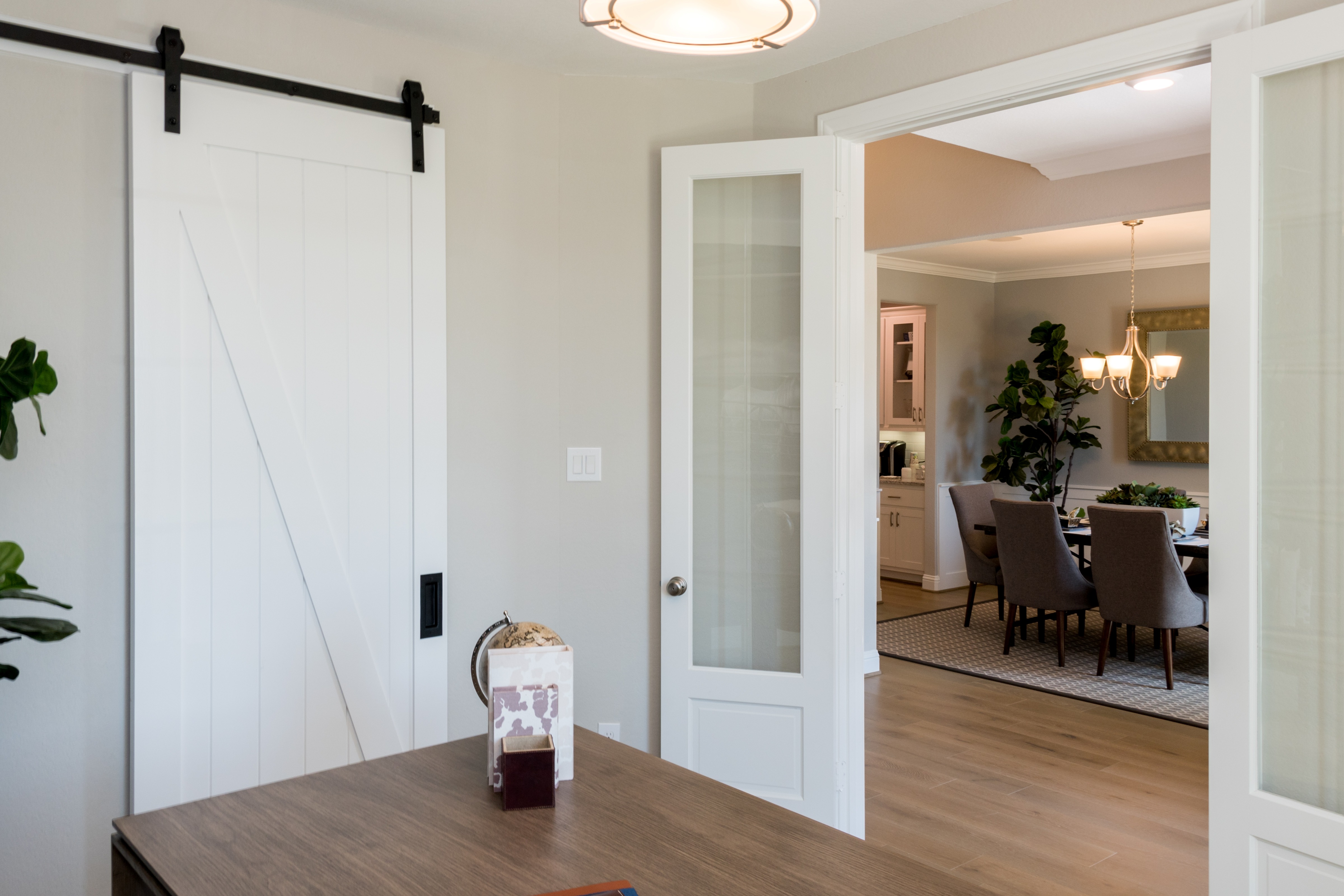 Modern home interior with a white sliding barn door on black hardware and a glass panel door opening into a dining room with table, chairs, and pendant lighting.