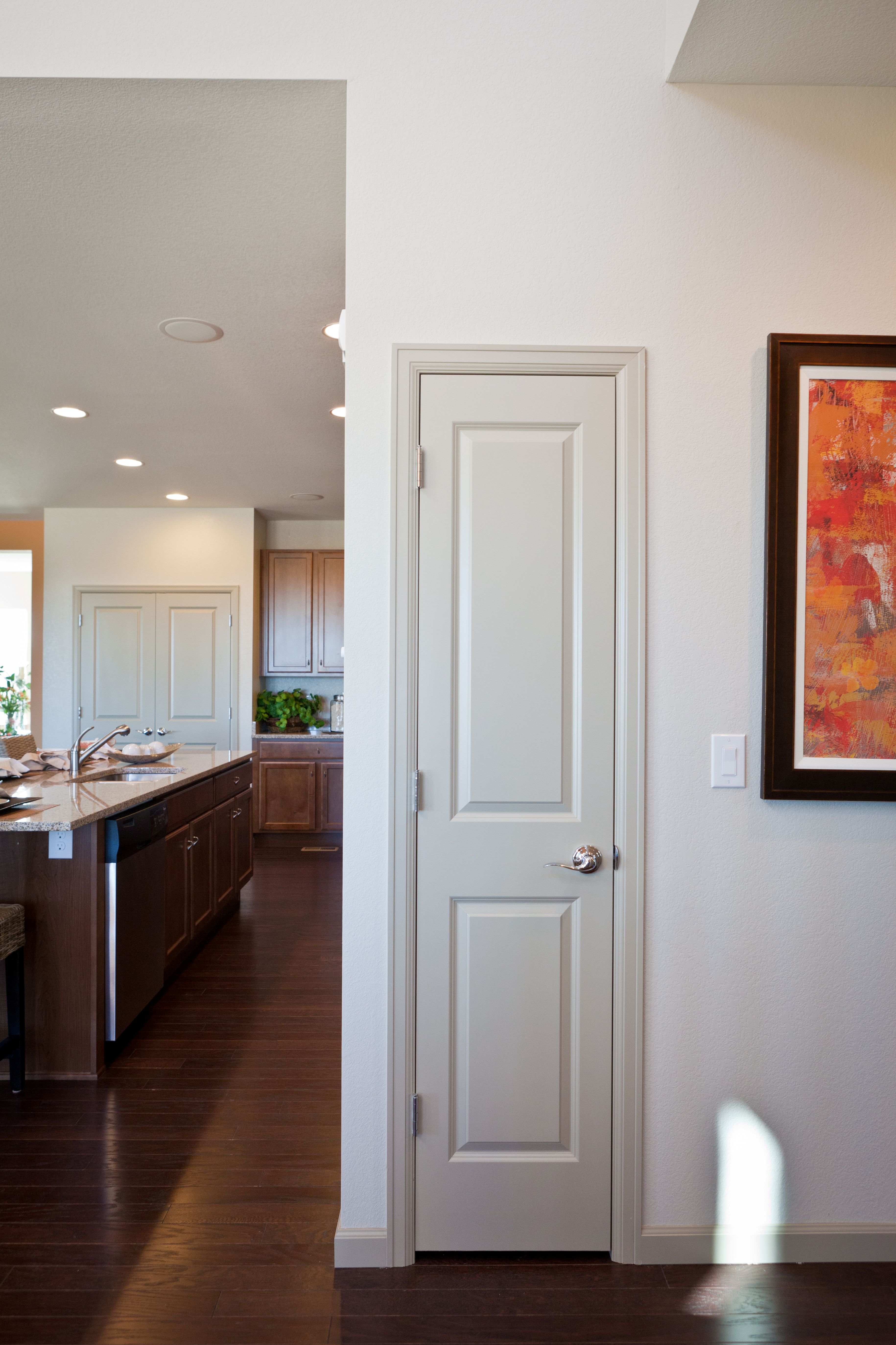 White two panel interior door with brushed nickel handle in a modern home hallway, with a kitchen featuring dark wood cabinets and recessed lighting visible in the background.