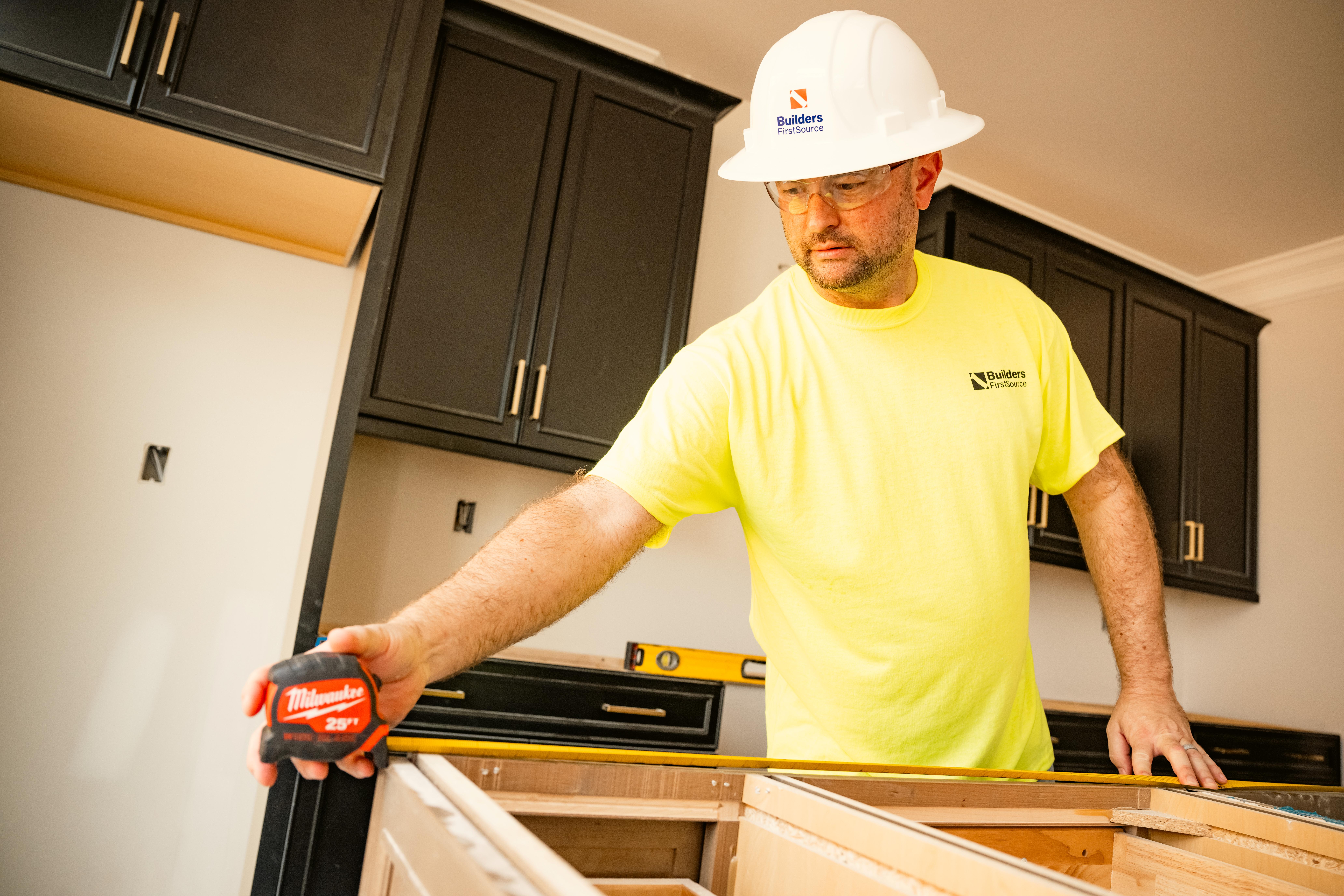 A Builders FirstSource team member wearing a white hard hat, safety glasses, and a high-visibility yellow shirt carefully measures a base kitchen cabinet using a tape measure. He is working inside a partially finished kitchen with dark wood upper cabinets already installed. A level rests on the cabinet behind him, highlighting attention to detail and craftsmanship during the installation process.
