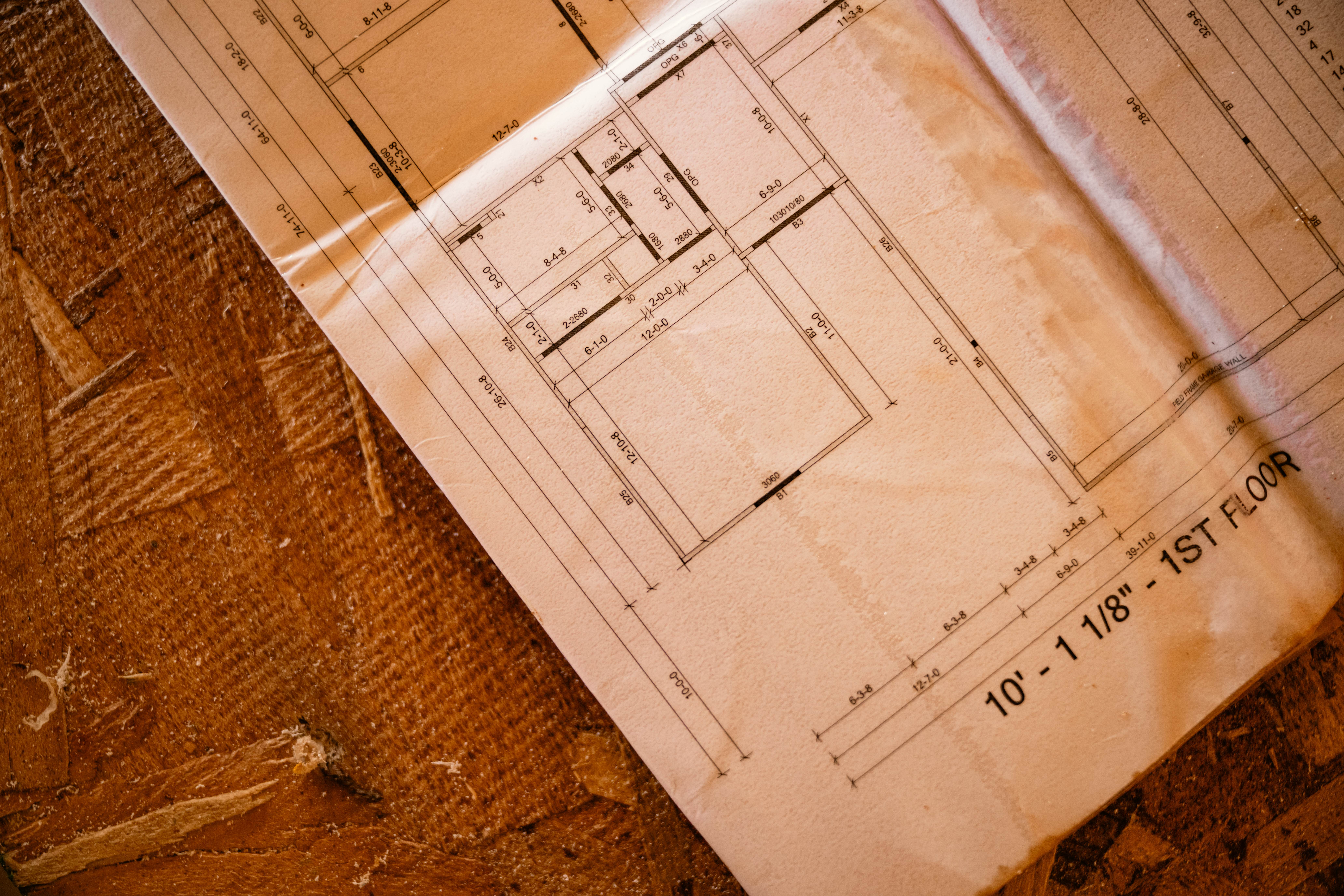 Close-up of a detailed architectural blueprint laid out on a worn wooden work surface, showing room dimensions, wall layouts, and labeled measurements for a first-floor plan. The paper has slight creases and stains, reflecting active use on a jobsite during the planning phase of construction.