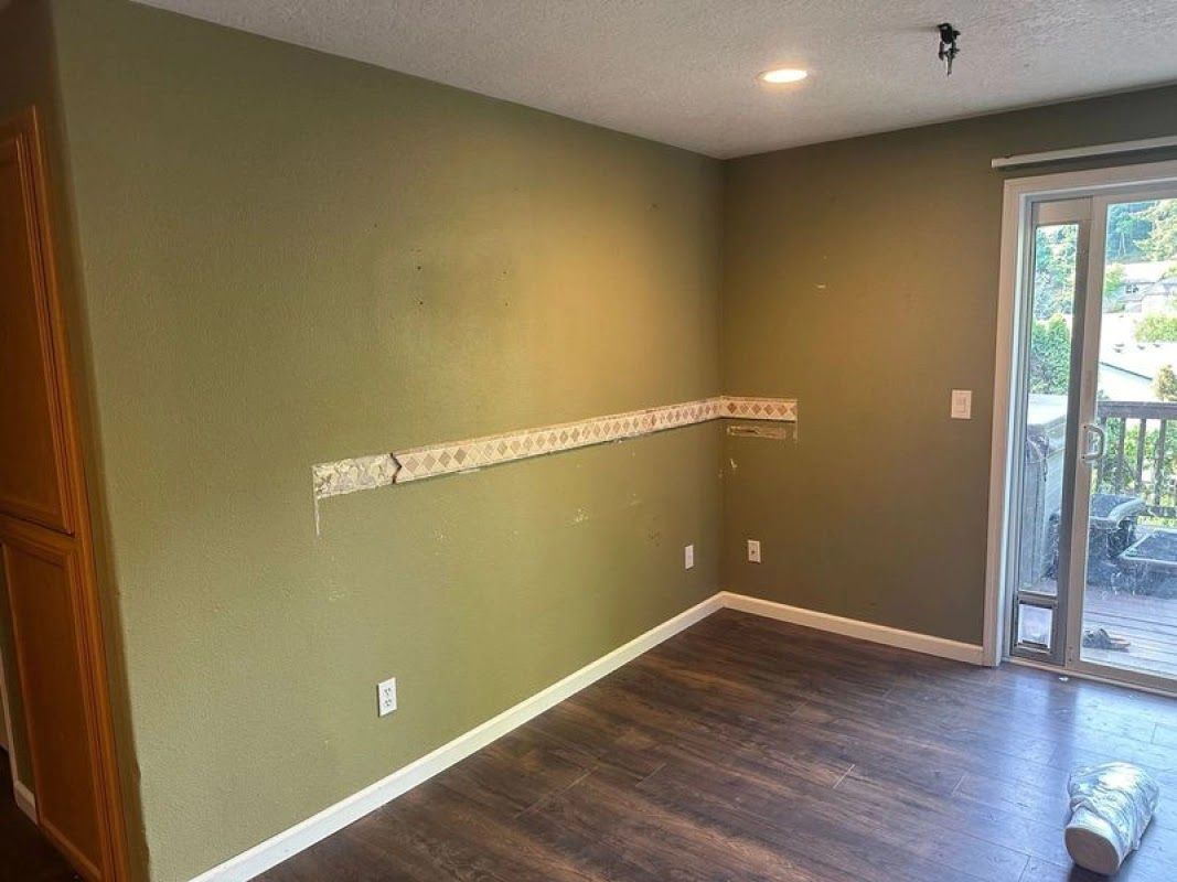 A room with dark olive-green walls and dark wood plank flooring is being renovated. A strip of old wallpaper border remains on the wall, showing where it was imperfectly removed during the upgrade.