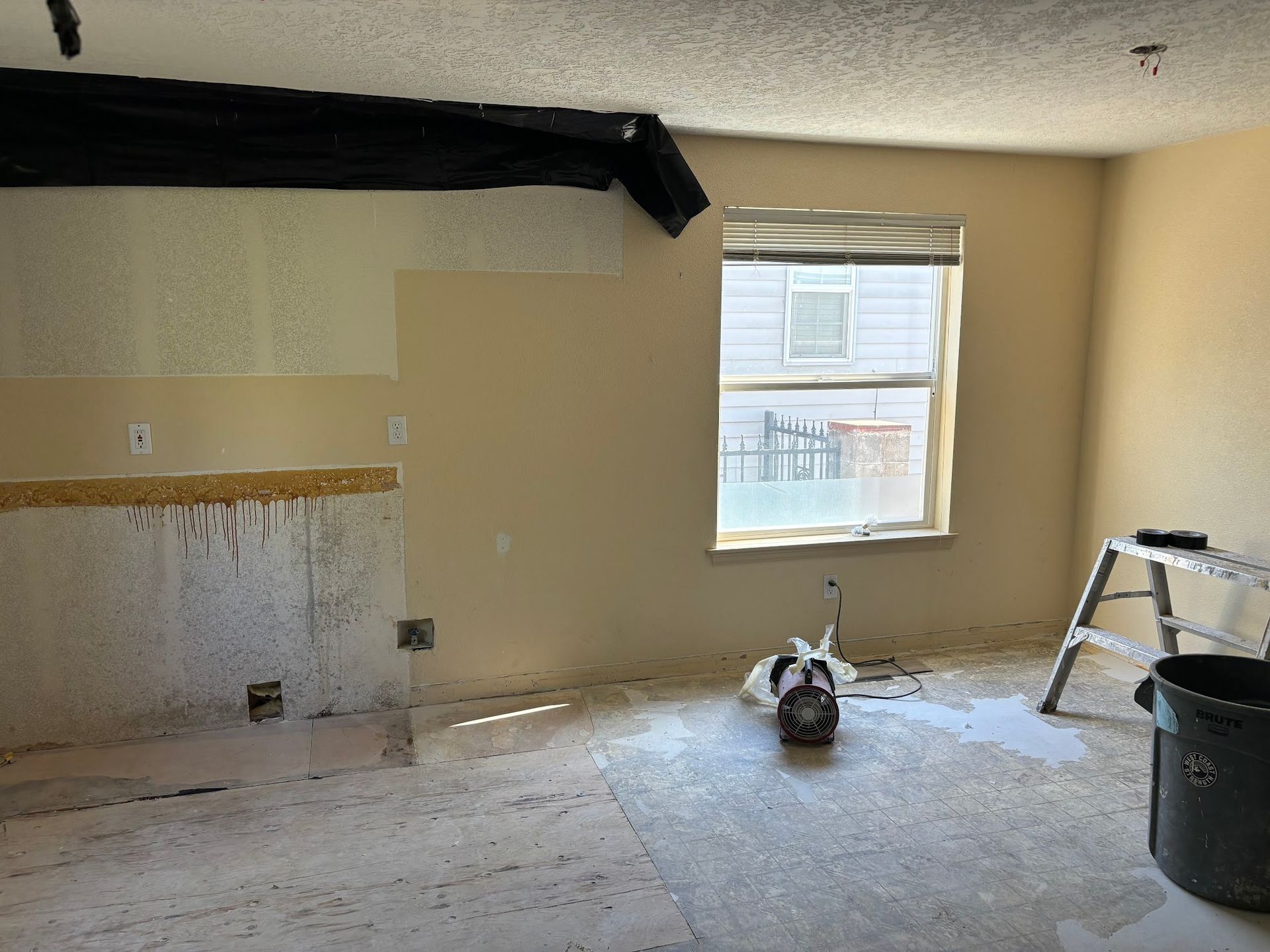 An interior room during demolition and renovation shows water damage on the exposed drywall and subfloor. A window is visible, and tools like a large black trash bin and a metal ladder are present.