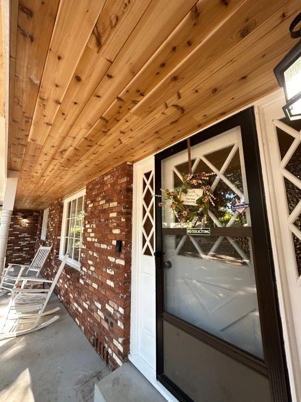 A residential front porch features a newly installed natural cedar plank ceiling above a red brick wall. A white front door with a black screen door and a floral wreath is visible on the right.