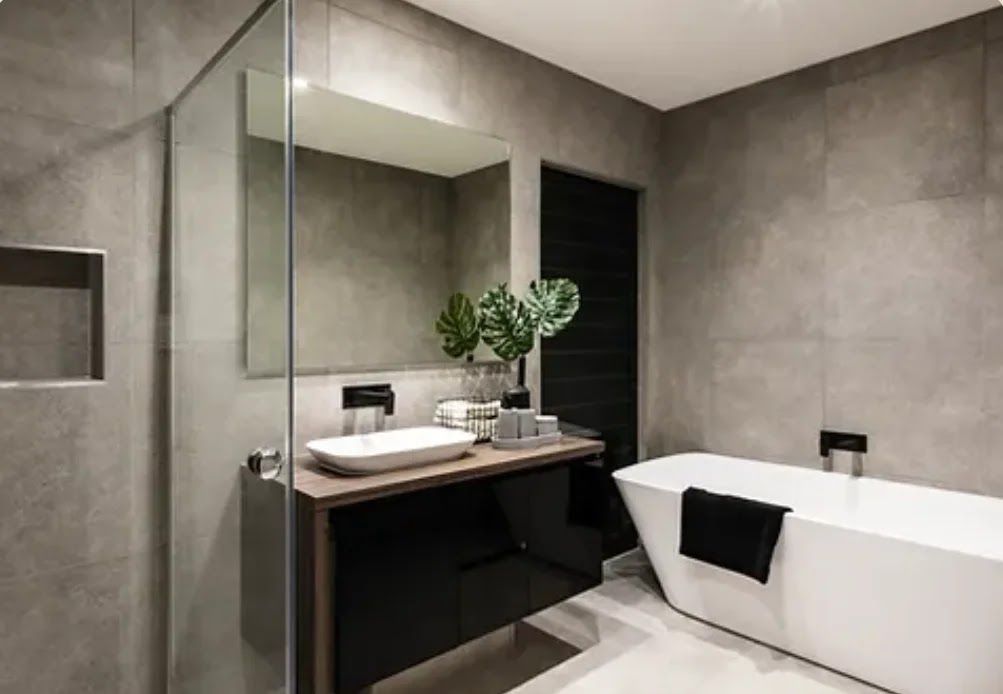 A sleek, modern bathroom features large grey wall tiles, a free-standing white bathtub, and a floating vanity with black high-gloss cabinetry. A glass panel separates the vanity area from the shower.