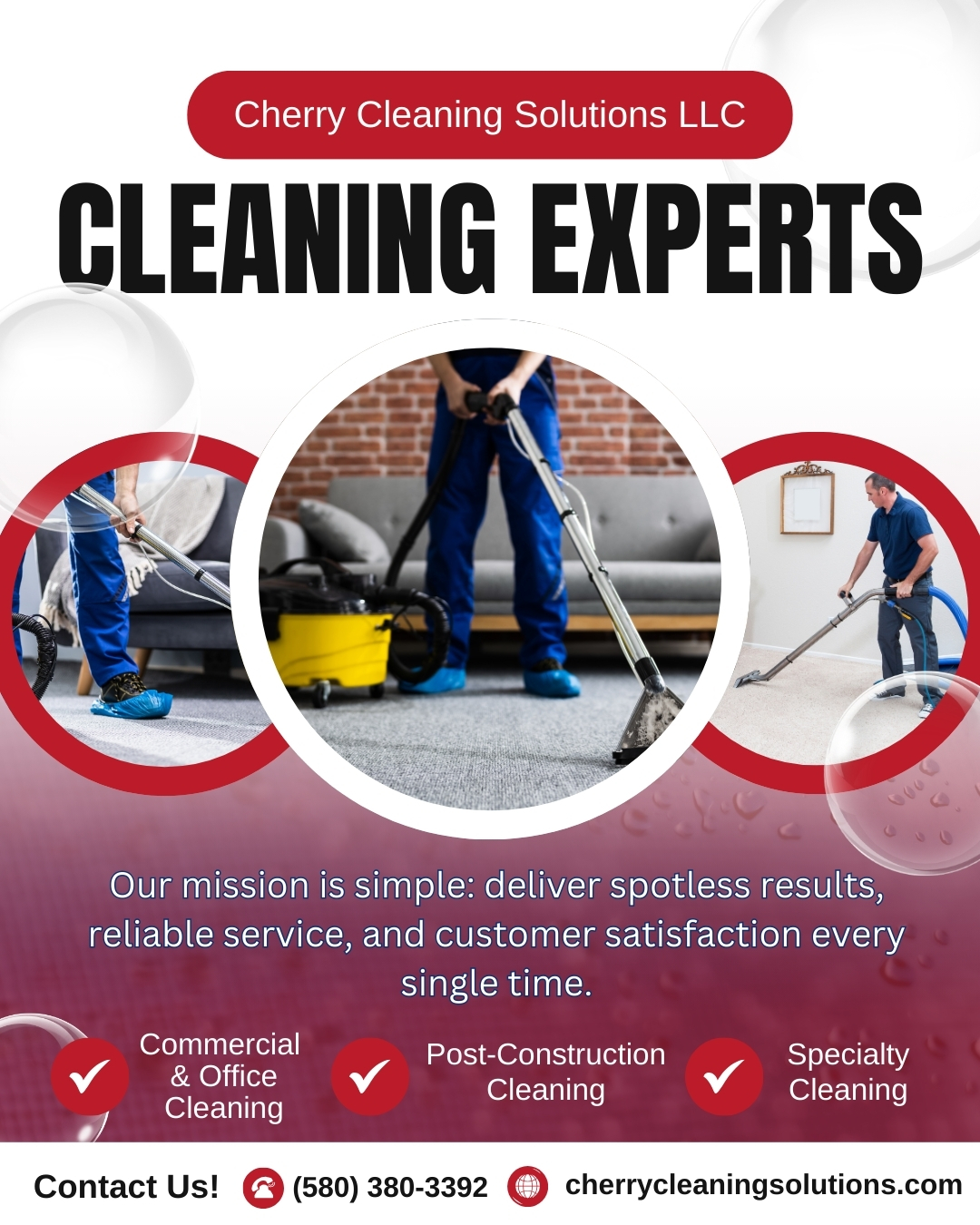 Cherry Cleaning Solutions is a full-scale cleaning company committed to helping others in our community with a spirit of excellence. We offer commercial/janitorial, post-construction, window, and carpet cleaning services. We are fully licensed, bonded, and insured. We understand how busy life gets and the challenges others face. Contact us today for your free estimate and let us make your life easier.