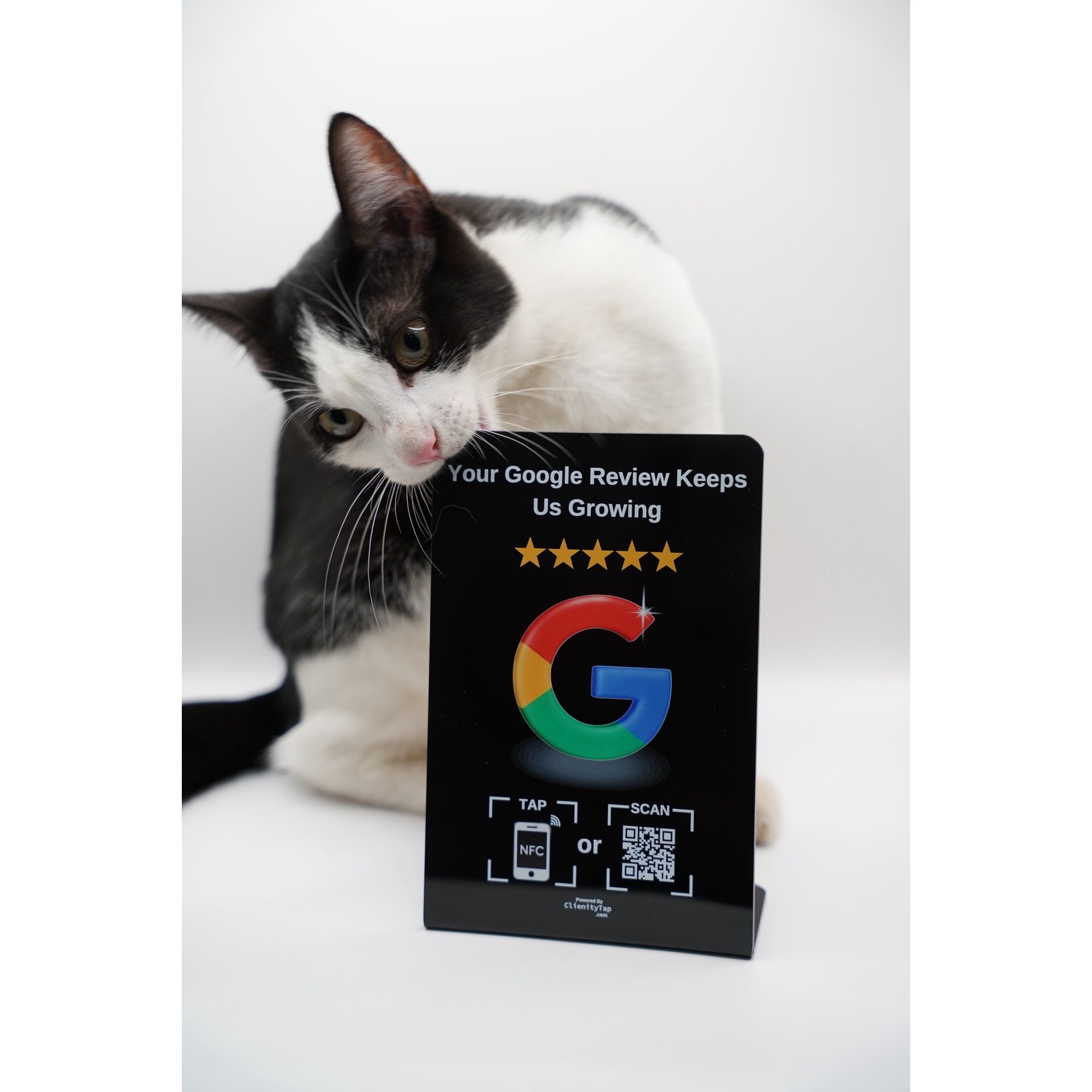 Clienity Tap NFC review card displayed clearly, designed to help businesses collect Google reviews easily with a simple phone tap.