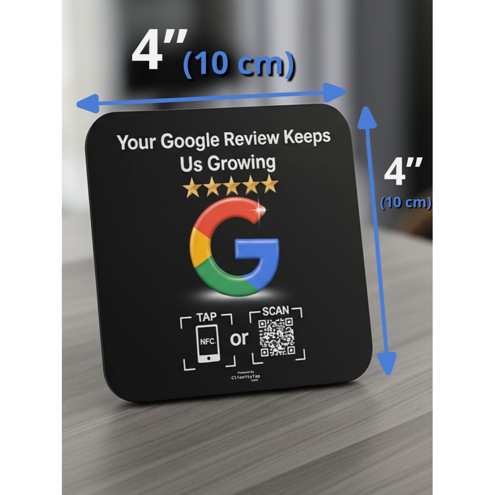 Compact Clienity Tap NFC review plate with a clean design, suitable for any business environment to collect Google reviews easily.