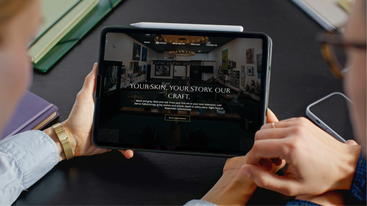 Tattoo studio website presented on a sleek device mockup, created by Codewrk LLC to support appointment-driven local businesses.