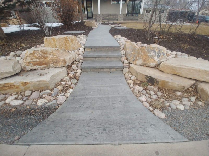 This photo features a curving front walkway made of gray concrete with a wood-plank texture. The walkway includes steps and is bordered by large, natural boulders and river rocks leading up to a house.