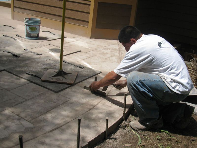 A construction worker, wearing a white shirt and blue jeans, is crouched down working on the edge of a newly poured, tan stamped concrete patio, setting up forms using metal stakes and tools.