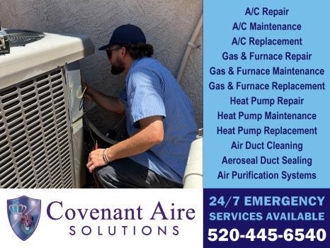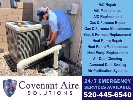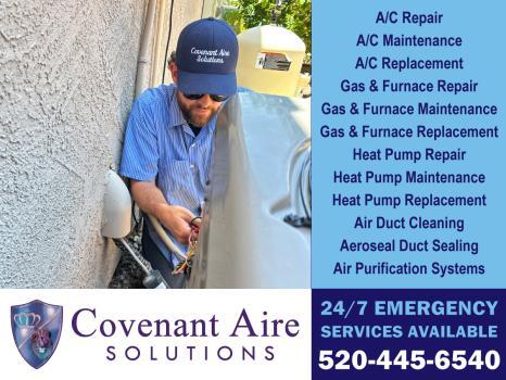 Covenant Aire Solutions provides top-tier HVAC repair and air conditioning services in Tucson, AZ. As a family-owned business, we specialize in comprehensive heating and cooling solutions, serving both residential and commercial clients since 2019. Our services include HVAC contractor services, furnace repair, air duct cleaning, air conditioning maintenance, and heat pump repair. We excel in emergency HVAC repair with 24/7 availability. Our certified, licensed technicians ensure reliable service with integrity. Committed to our community, we offer flexible financing and exclusive discounts for military and service professionals. For trusted HVAC solutions, reach out to Covenant Aire Solutions today.