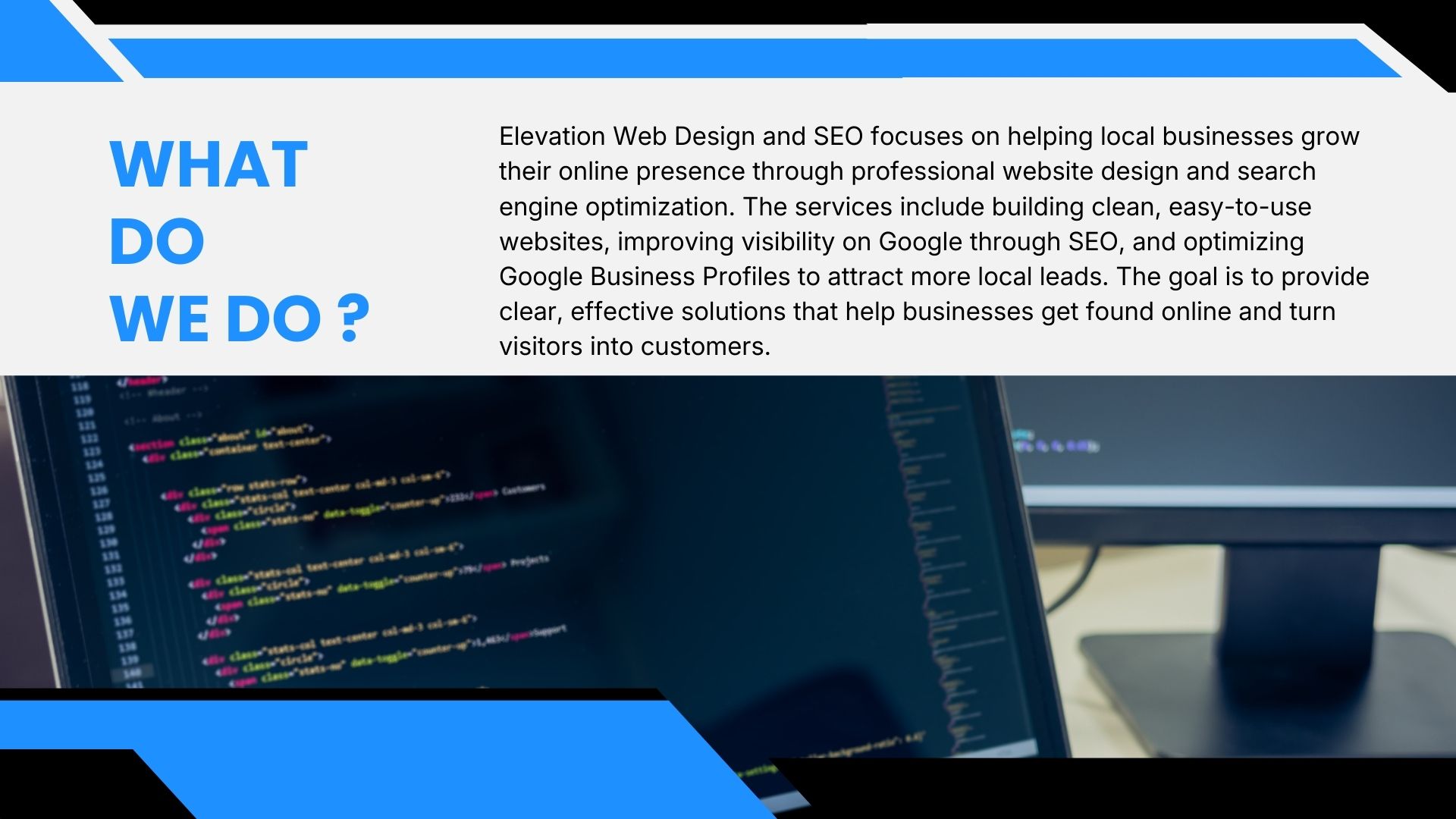 Elevation Web Design and SEO helps local businesses get more visibility, more leads, and more customers. The focus is on building clean, professional websites that not only look great but also perform well in search results. A strong website means little if potential customers cannot find it, which is why every project is paired with SEO and Google Business Profile optimization to improve rankings and drive real results.