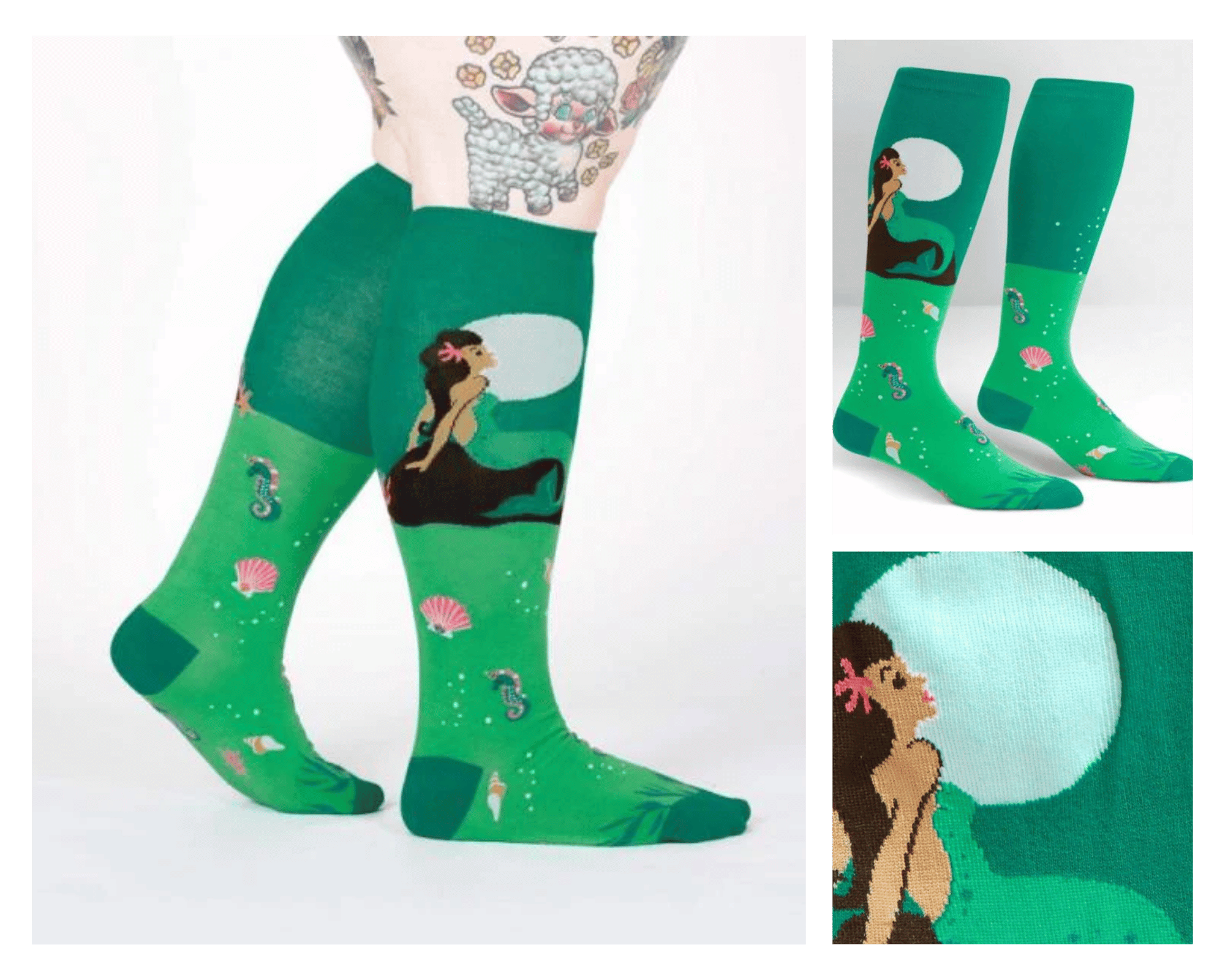 KNEE HIGH- MOONLIGHT MERMAID We fulfilled our number one customer request and developed proprietary technology to create our awesome designs on stretchier socks—up to 21 inches in circumference without distorting the graphics.