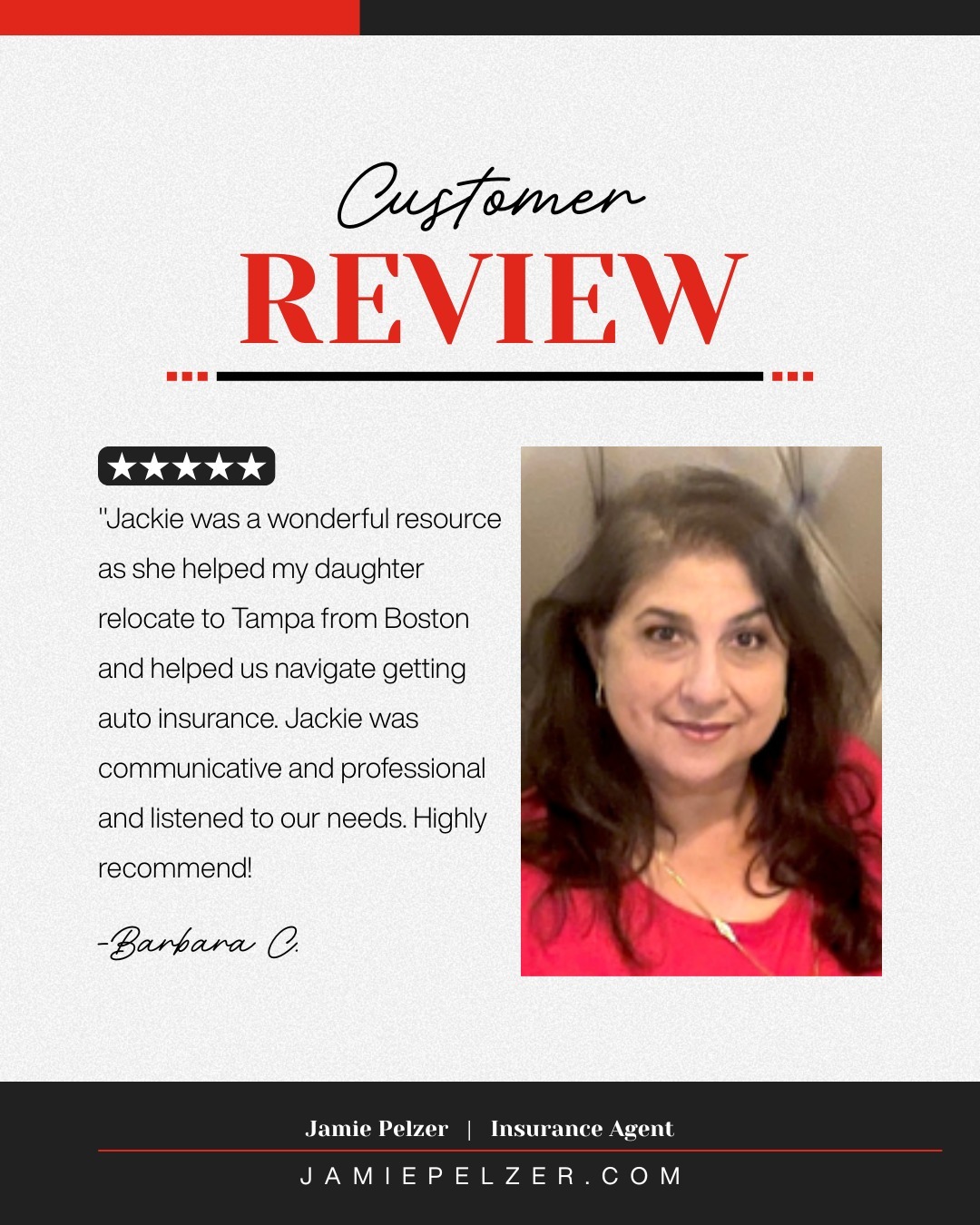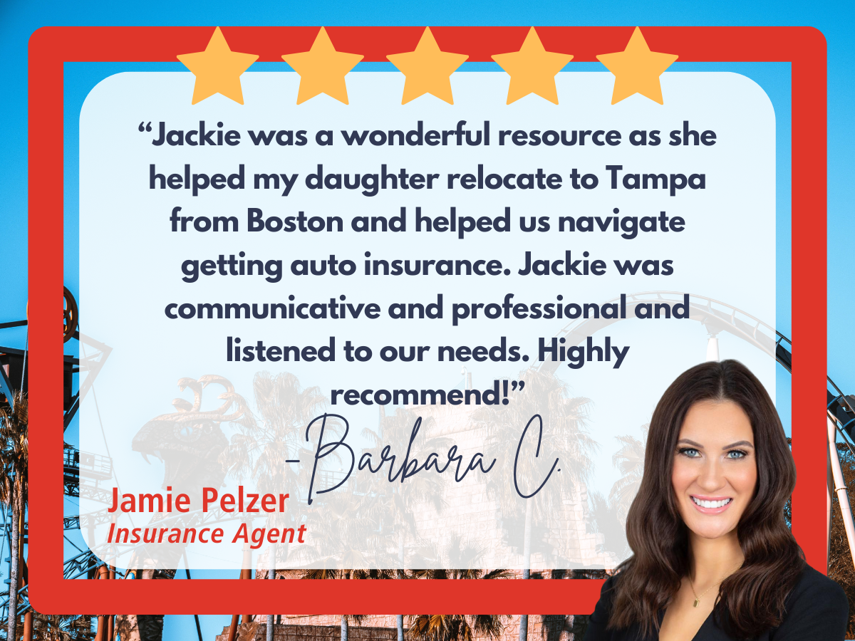 Shoutout to Jackie! She helped Barbara’s daughter relocate from Boston to Tampa, making auto insurance smooth and stress free. We appreciate customers who share their experiences and team members who go above and beyond!