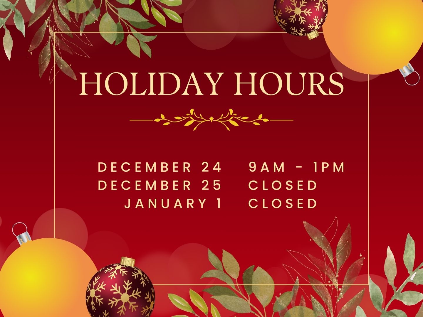 Happy Holidays! Below are our holiday hours for the upcoming week and the week of New Year’s. We wish everyone a joyful and safe holiday season! 🎄