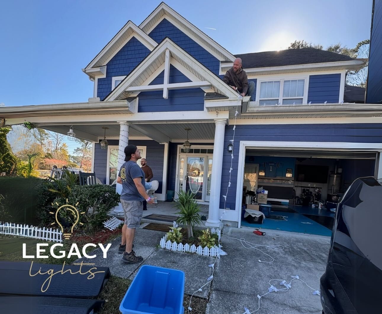 A blue, two-story house with a porch serves as the setting for two workers installing bright white string lights. One worker is on the porch roof, while the other stands below in the driveway.