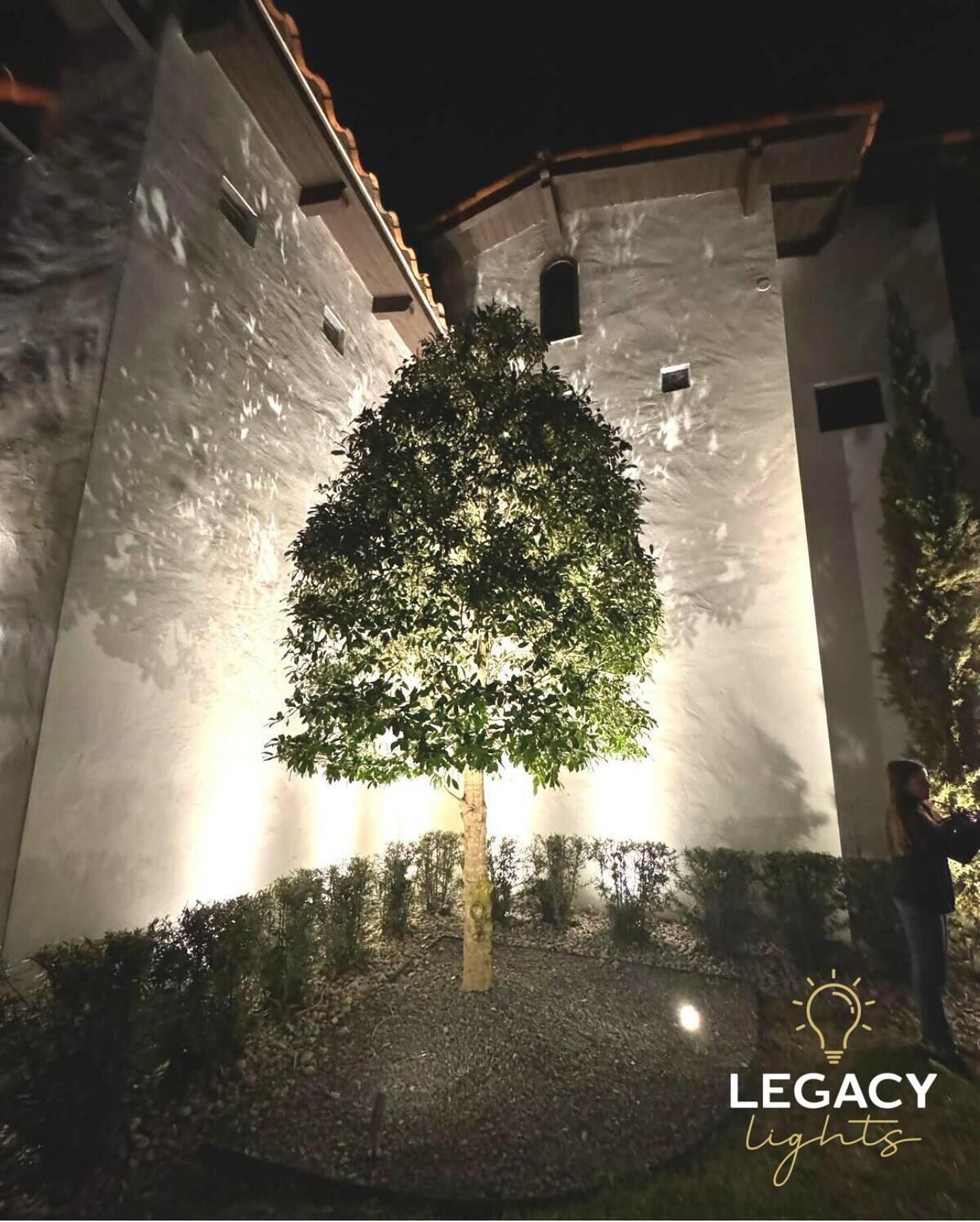 A tall, dense tree is illuminated from below by multiple warm-white uplights, casting its dramatic, textured shadow onto the stucco wall of the tall, Mediterranean-style building behind it.