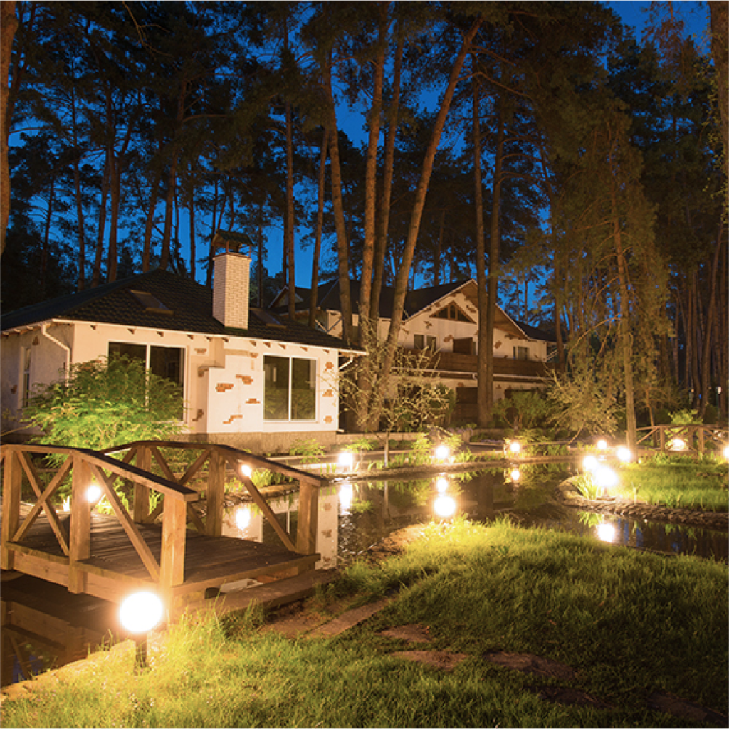 A charming wooden footbridge crosses a small pond, leading to two white houses in a dense forest setting. The area is illuminated by warm, glowing globe lights along the path and pond.