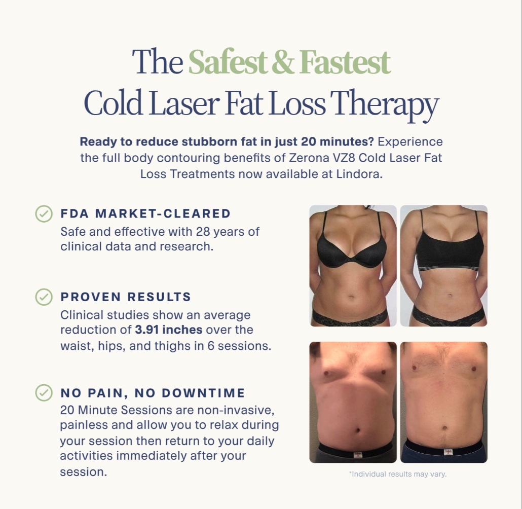 Lindora Windermere Wellness & Weight Loss specializes in weight loss programs with and without the use of GLP-1s, IV Hydration Therapy, Hormone Replacement Therapy for men and women and Zerona VZ8 violet laser, noninvasive targeted fat loss.