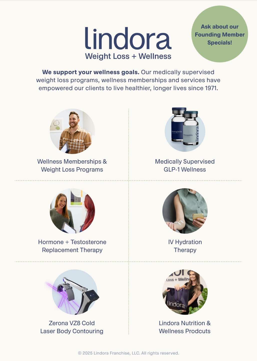 | Services | Wellness Shots, Weight Loss Services, Weight Management, GLP-1, Vitamin Shots, Health Spa, Lindora Nutrition, Wellness Services, IV Therapy, Weight Control, HRT & TRT |