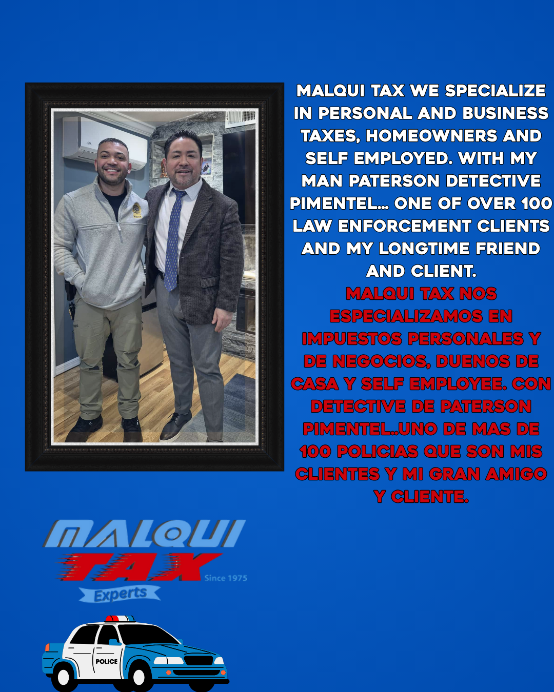 Ceasar B. Malqui es un preparador de impuestos de confianza y Presidente de Malqui Tax Experts, con sede en Paterson, Nueva Jersey. Como uno de los profesionales de impuestos mejor calificados en el área, Ceasar ofrece servicios tributarios expertos y personalizados tanto a individuos como a empresas. Con casi tres décadas de experiencia, sus servicios incluyen la preparación de declaraciones de impuestos individuales simples y complejas (Formulario 1040), contabilidad, creación de nuevas empresas, declaraciones de impuestos corporativos, declaraciones de impuestos sobre sucesiones y trámites de solicitud y renovación de ITIN. Reconocido por su atención al detalle y su enfoque centrado en el cliente, Ceasar está comprometido a ayudar a sus clientes a presentar sus impuestos con confianza y claridad.