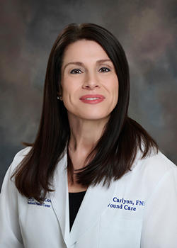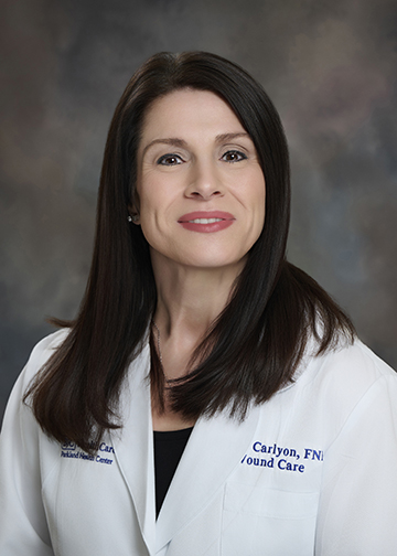 Mindy Carlyon, FNP, is a board-certified family medicine nurse practitioner at the Wound Care Center at Parkland Health Center. Mindy provides wound care to patients of all ages, for chronic wounds, arterial and venous ulcers, diabetic foot ulcers and diabetic wounds, MRSA wounds, pressure ulcers, minor burns, traumatic injuries, non-healing post-surgical wounds, radiation damage, and skin tears and lacerations. Treatments include individualized wound assessment and treatment plans are offered, including infection control, vascular studies, skin grafting or skin substitutes, nutritional evaluation, blood work, wound debridement, hyperbaric oxygen therapy and placement of protective devices.