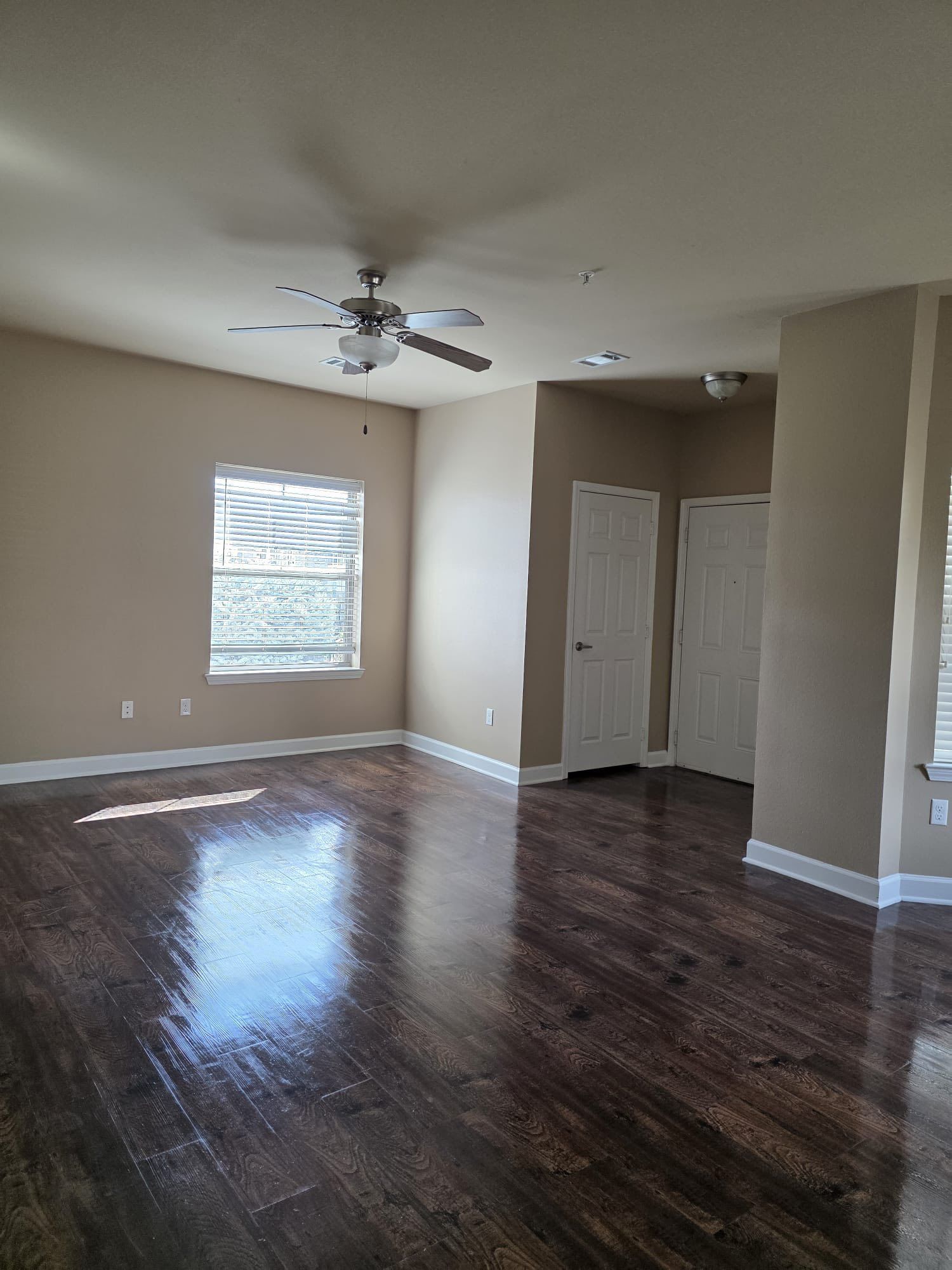 An empty living area with dark wood flooring, beige walls, and a ceiling fan. Natural light enters through a window with blinds, creating a bright and spacious residential interior.