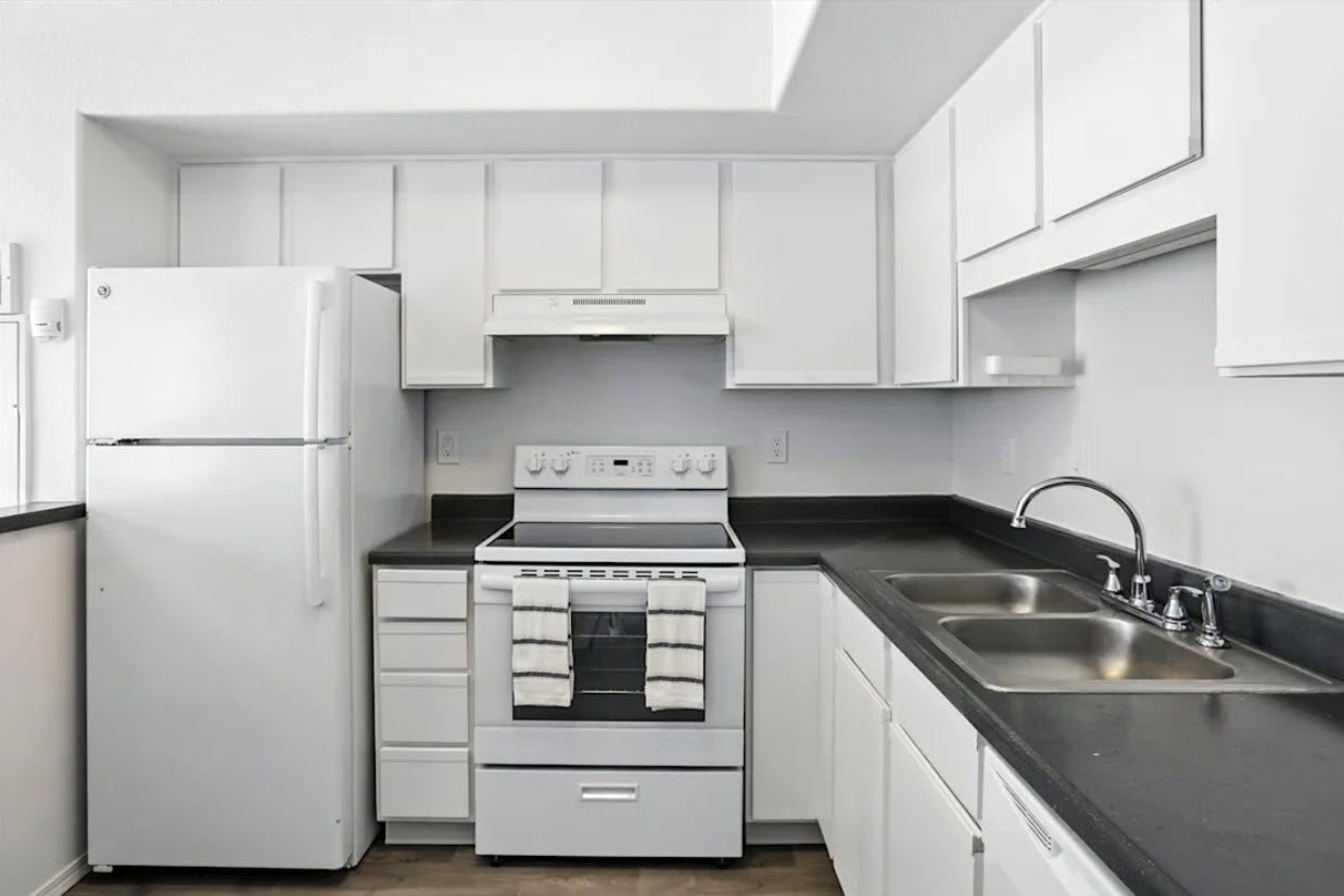 A white kitchen with a stove, sink, and refrigerator.